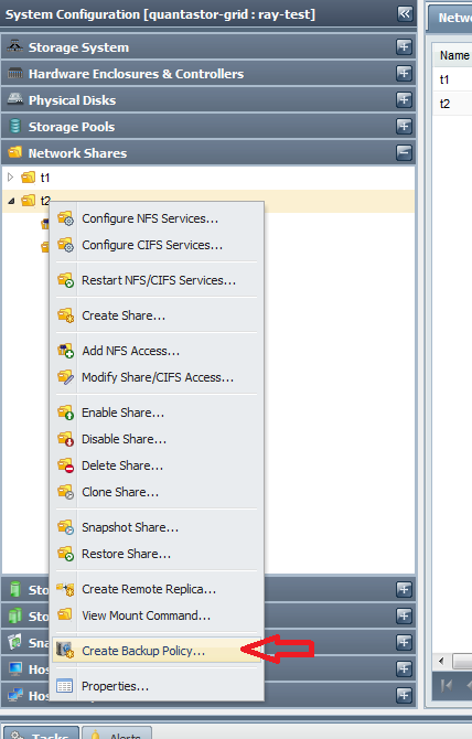To create a backup policy in a QuantaStor appliance right-click on the Network Share where you want the data to be backed up to and choose the ‘Create Backup Policy’ option (Figure 1). From here you’ll select the CIFS/NFS share on your network to be backed up, and the times at which you want the backup jobs to run.