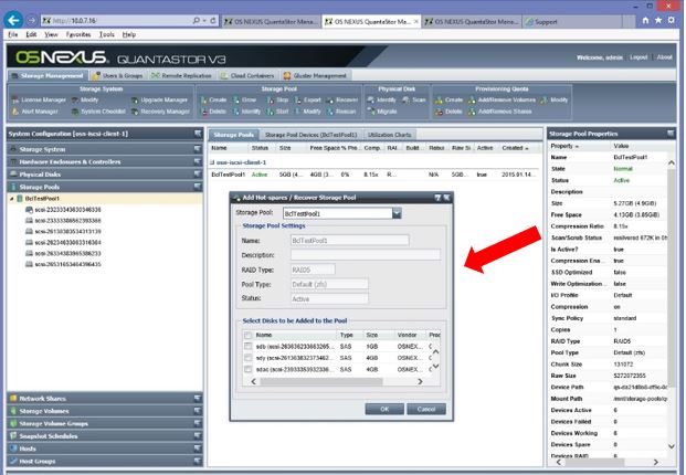 For more information about Hot Spare Management and Storage Pool Sizing see the OSNEXUS Solution Design Guide.
