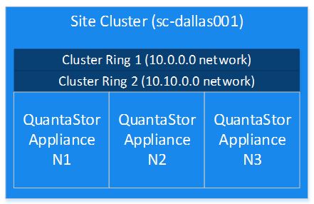 To create a Site Cluster you must first create a QuantaStor grid with at least two nodes to create highly-available resources (Virtual IP addresses). Note that you’ll want to have set up two network ports on each appliance on separate networks to facilitate the Site Cluster heartbeat mechanism. On each network a “Heartbeat Ring” or Cluster Ring is formed. By having two rings the site cluster configuration is made resilient and flexible to network configuration changes. We always recommend setting up two rings for HA rather than a single ring configuration (Figure 2).