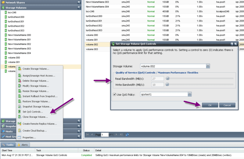 Please note, if you set specific non-policy QoS settings for a Storage Volume these will override remove any QoS policy setting associated with the Storage Volume. The reverse is also true, if you have a specific QoS setting for a Storage Volume (eg: 200MB/sec reads, 100MB/sec writes) and then apply a QoS policy to the volume as the limits set in the policy will override the Storage Volume specific settings.