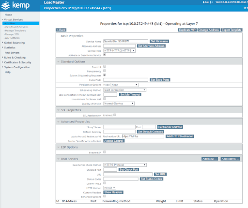 Kemp LoadMaster is a load balancer that works with a myriad of different technologies, for example, S3 on Ceph. Other alternatives include DNS round-robin and HAproxy. A virtual interface is created that handles the requests to real servers.