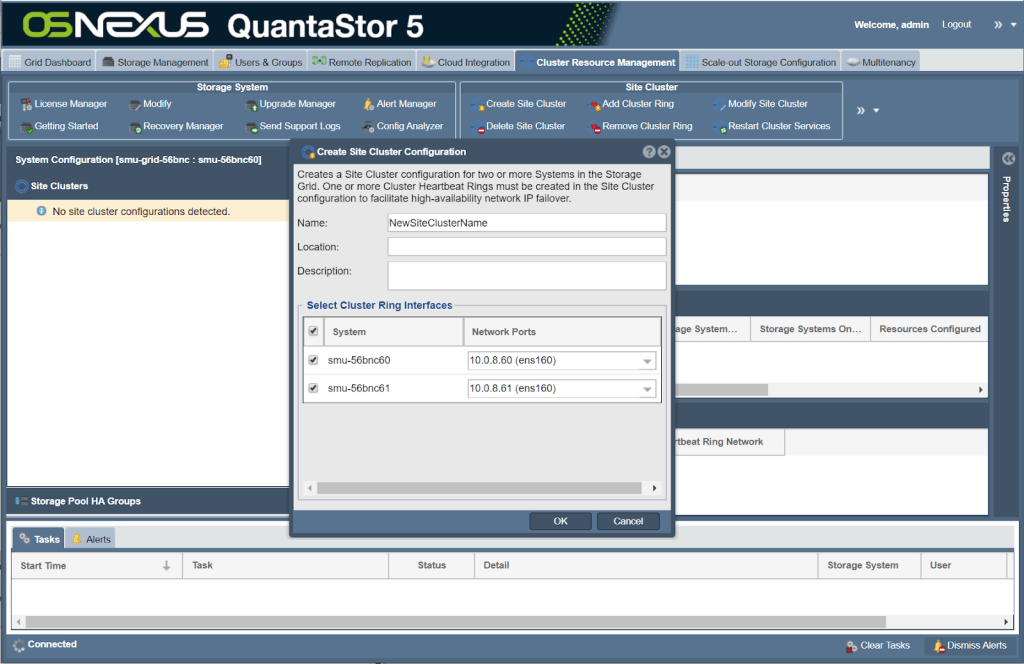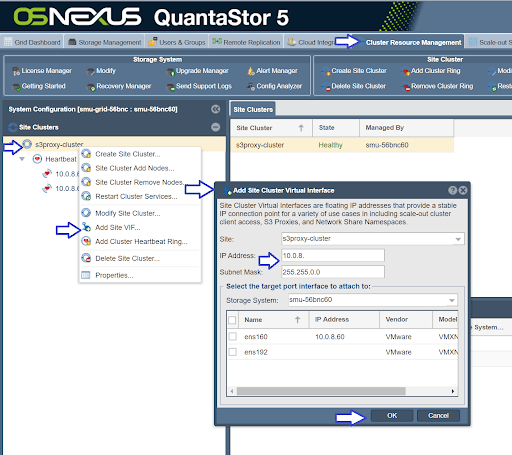 Step 3) Navigate to the Cluster Resource Management tab then create a ‘Site Cluster’. This establishes a cluster with a heartbeat between the two systems. Fast links are not required for this, 1GbE or 10GbE are both sufficient. A good name for the Site Cluster would be “s3proxy-cluster” or something like that.
