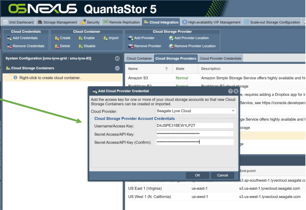 - Add Lyve Cloud credentials to QuantaStor under the ‘Add Cloud Provider Credential’ window in the Cloud Integration tab.