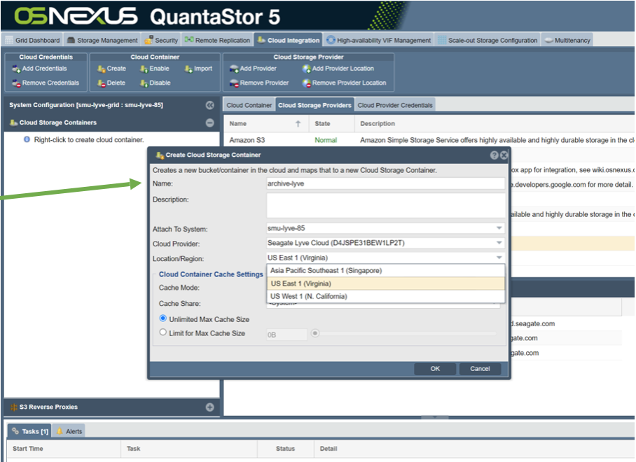 - ‘Create Cloud Container’ via QuantaStor to create a NAS bucket in Lyve Cloud or import an existing bucket.