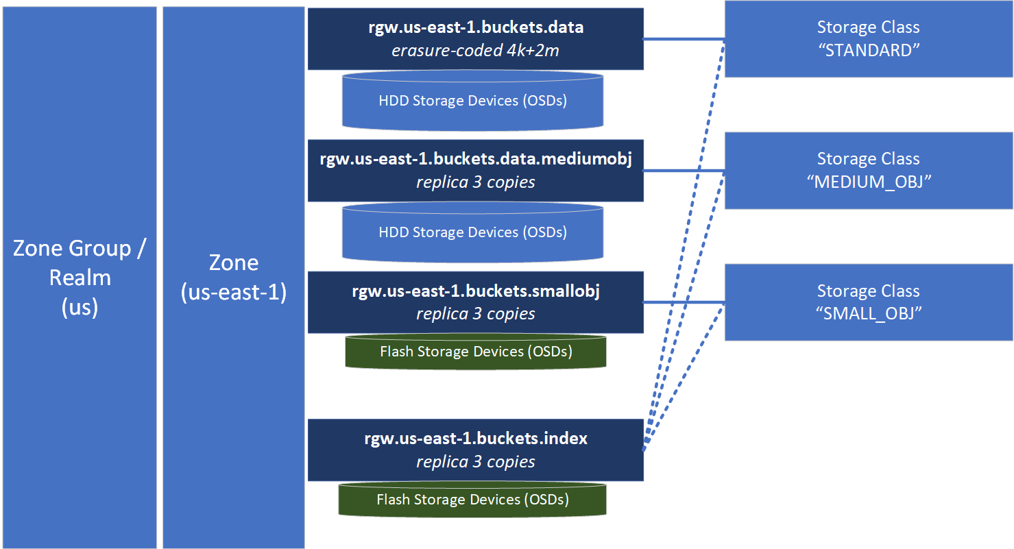 Having different tiers (Storage Classes) is really important not just for cost savings but also for performance considerations. As we discussed in Part One if you’re uploading millions of small 1K objects it is a generally bad idea to write those objects into an erasure-coded data pool. It’ll be slow, you’ll waste a lot of space due to object padding, and you’ll have unhappy users. But the key is to have the objects get assigned to a suitable storage class automatically as users oftentimes will not make the effort to categorize them themselves.