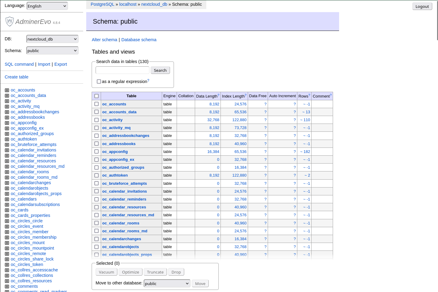 Adminer (formerly known as phpMinAdmin) is a tool for managing content in databases. It natively supports MySQL, MariaDB, PostgreSQL, SQLite, MS SQL, Oracle, Elasticsearch and MongoDB. In our case, we’re managing PostgreSQL, and to be clear, the PostgreSQL plugin is the only one that was installed. If you installed it during the install process it can be accessed from this address: https://<ip | fqdn>:9443