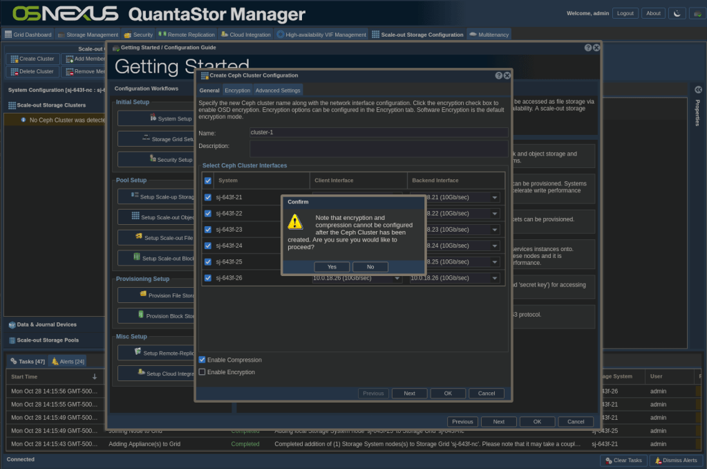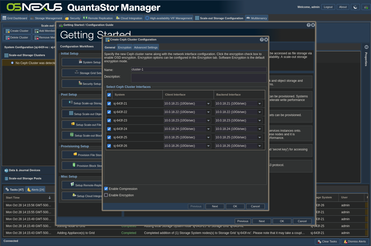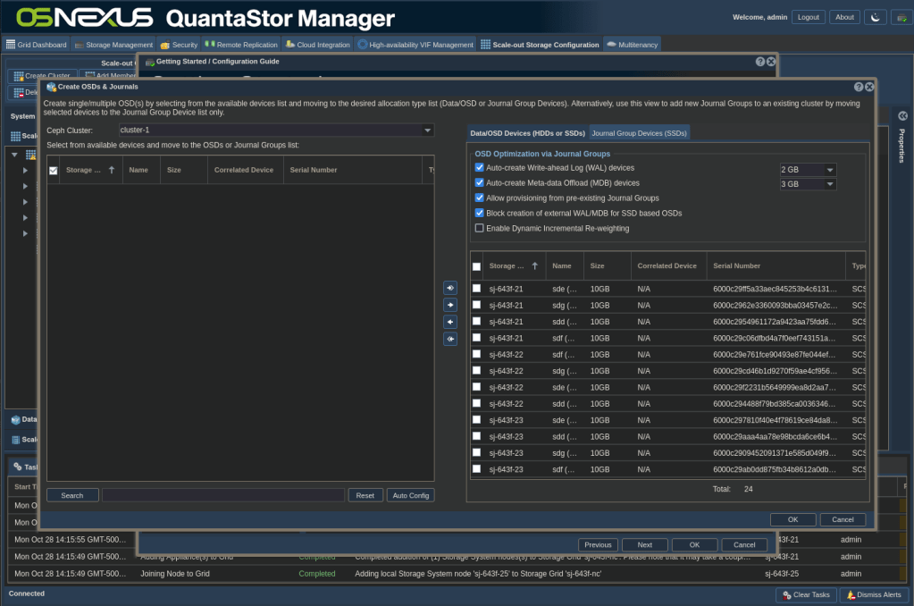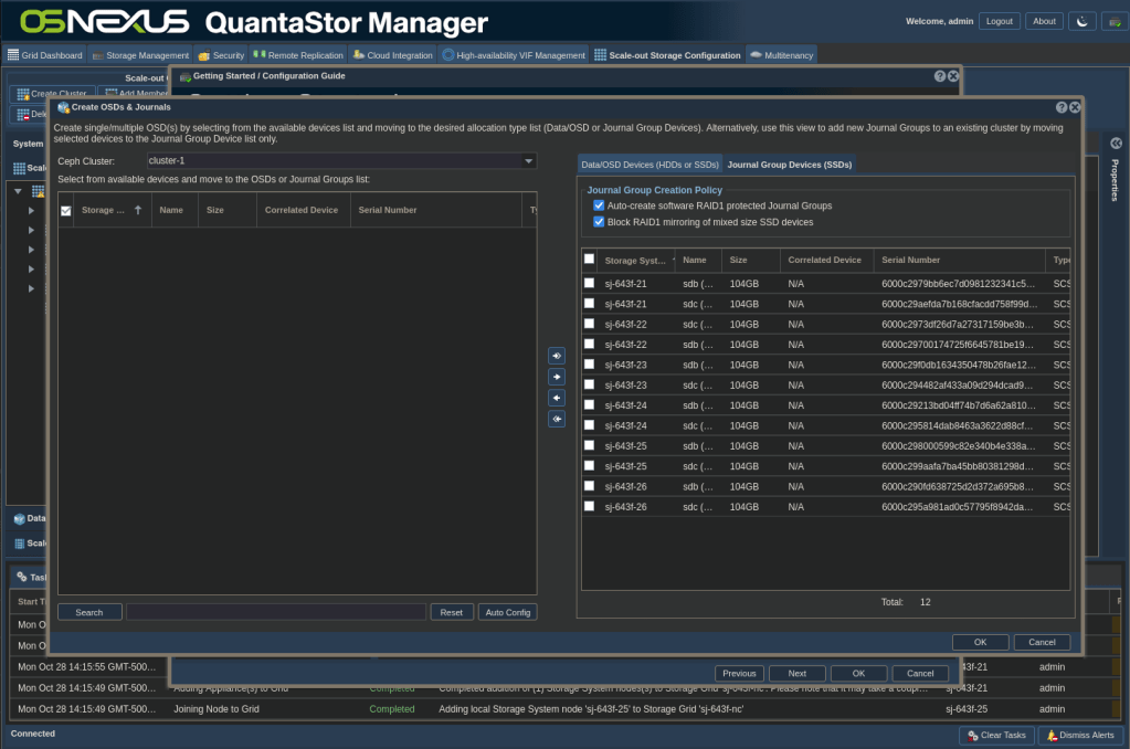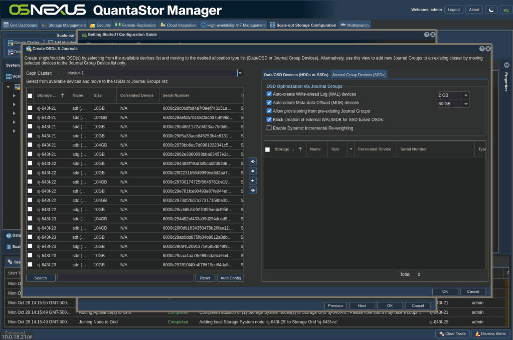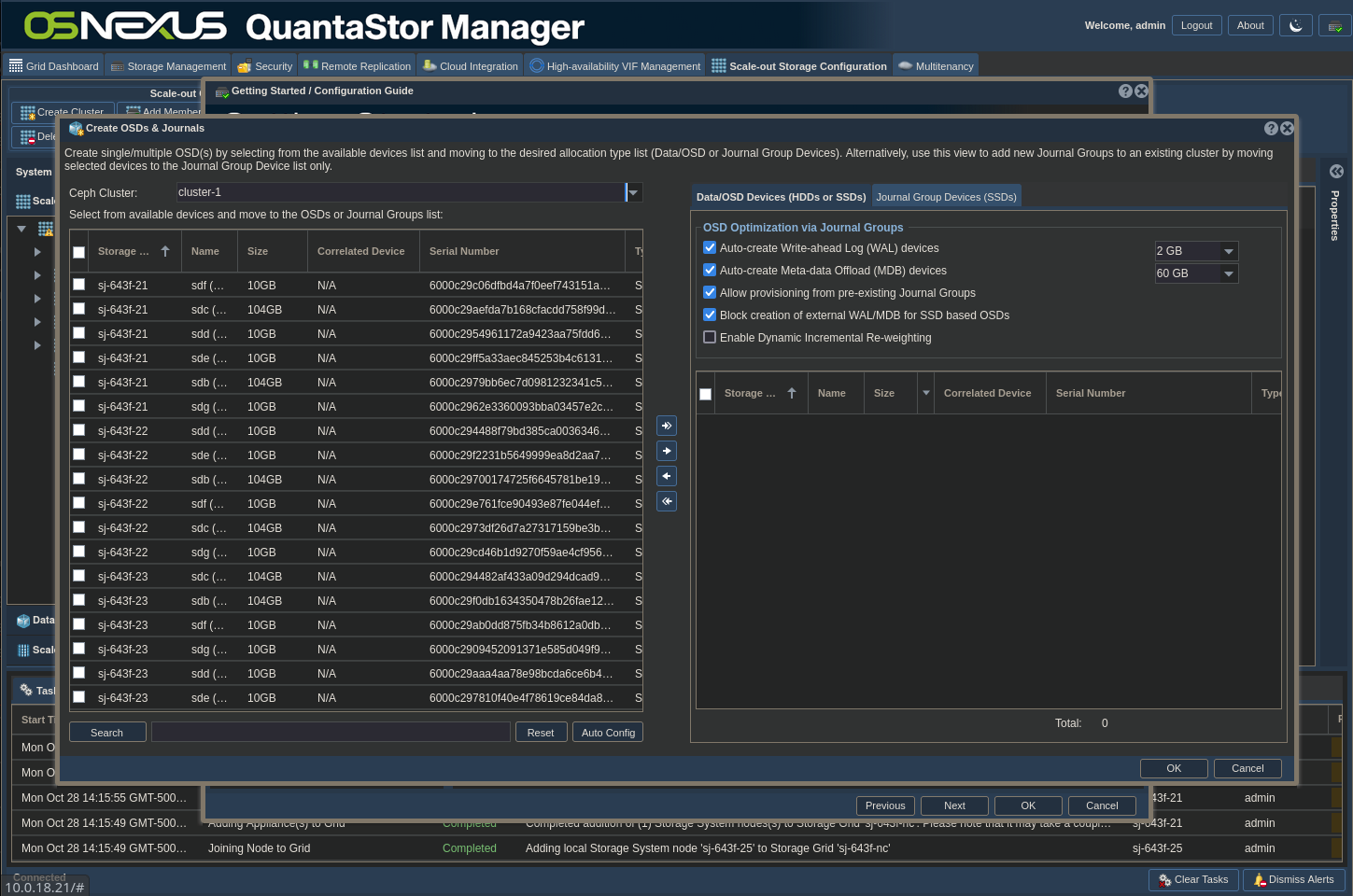 Note: This process will take a little while to complete, depending on the size of your cluster. If you close the Getting Started dialog and select the Data & Journal Devices element in the left pane you can monitor the progress both in the Main Content Pane as well as by expanding the tree view in the Navigation Pane.