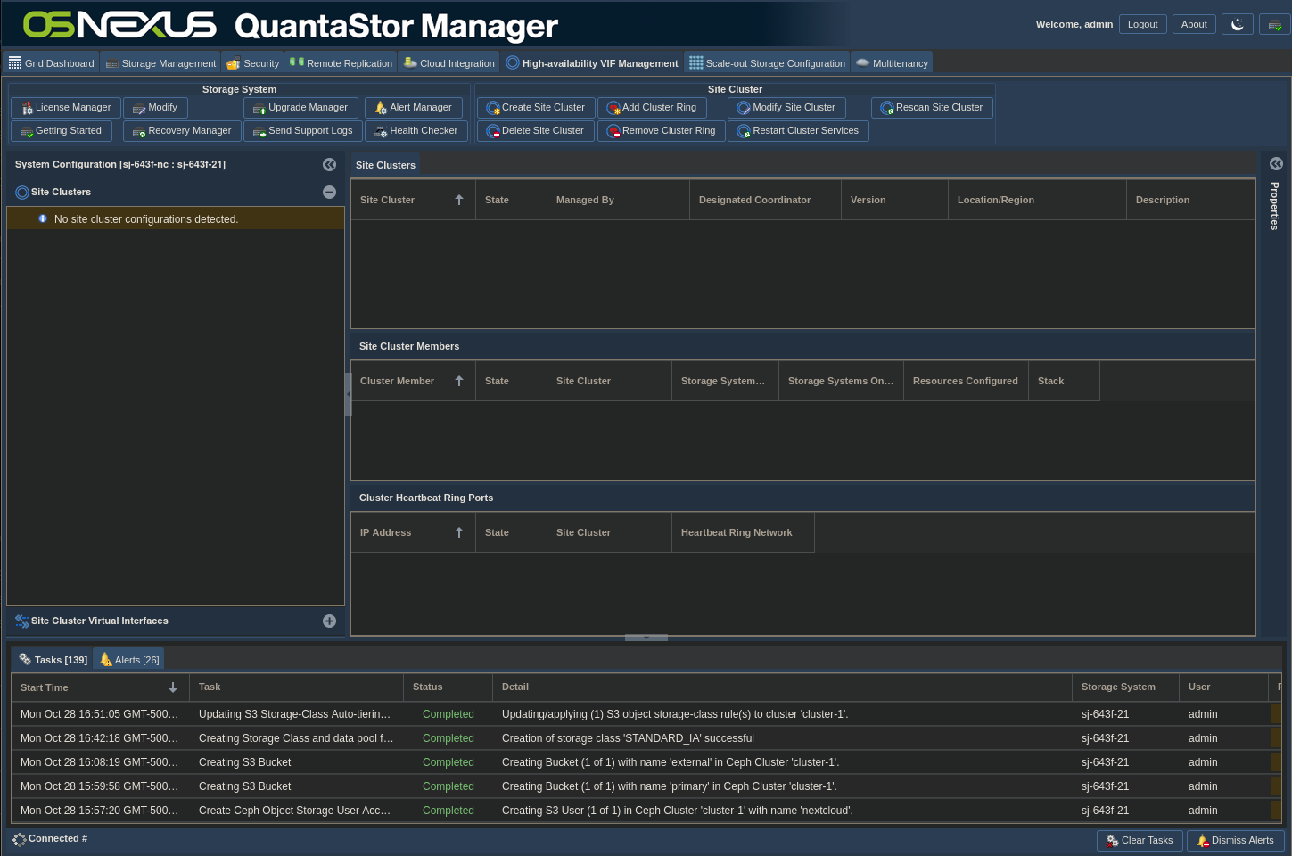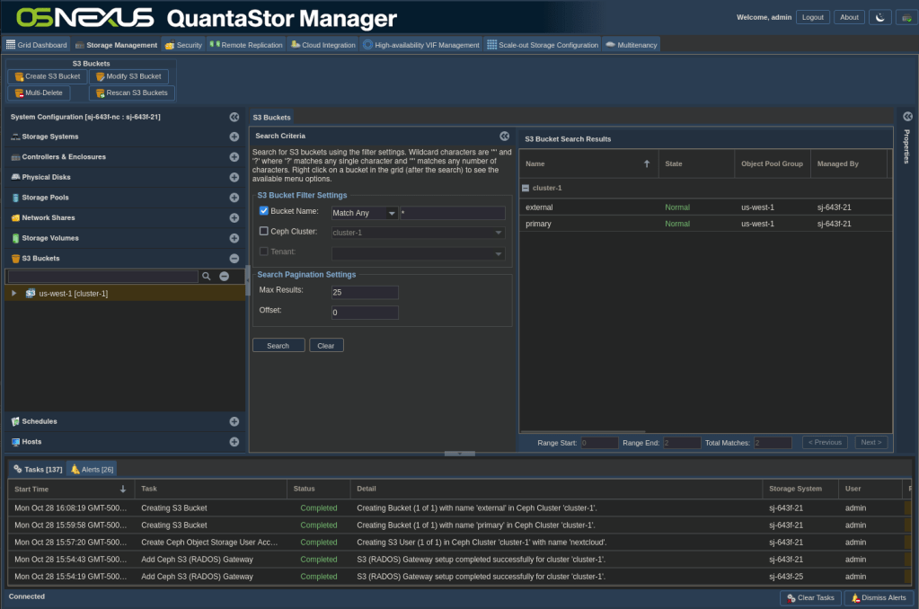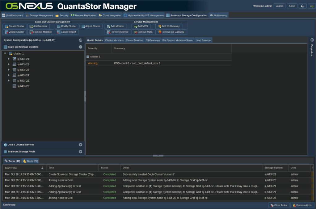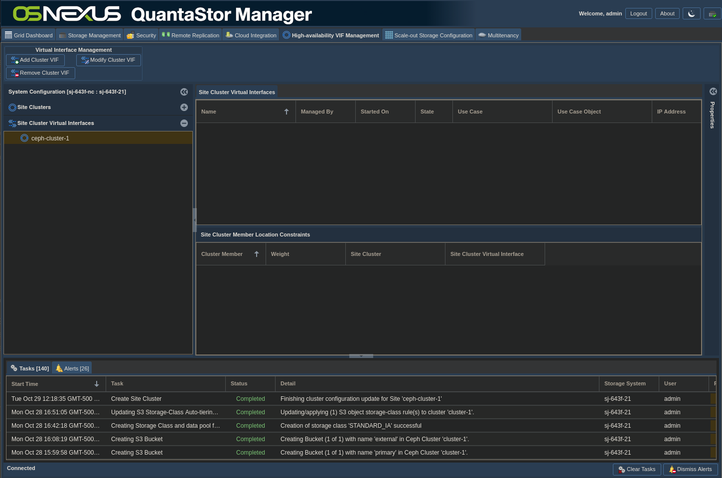 Remember when we created a second Storage Class and an Auto-tiering rule for the Scale-out Object Storage cluster? Let’s take a look at what that did for us. In the CLI, SSH to one of your QuantaStor nodes: