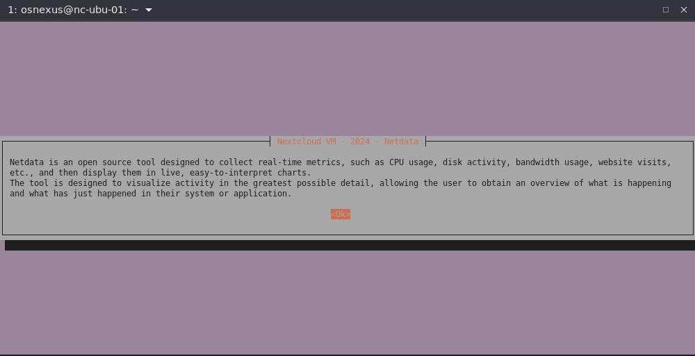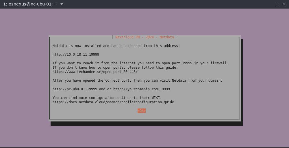 Installing this way is not only simple, but the authors have added some system level services that can make managing the Nextcloud host easier. Namely, with the install I’ll be installing Netdata, Webmin and Adminer.