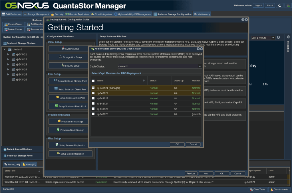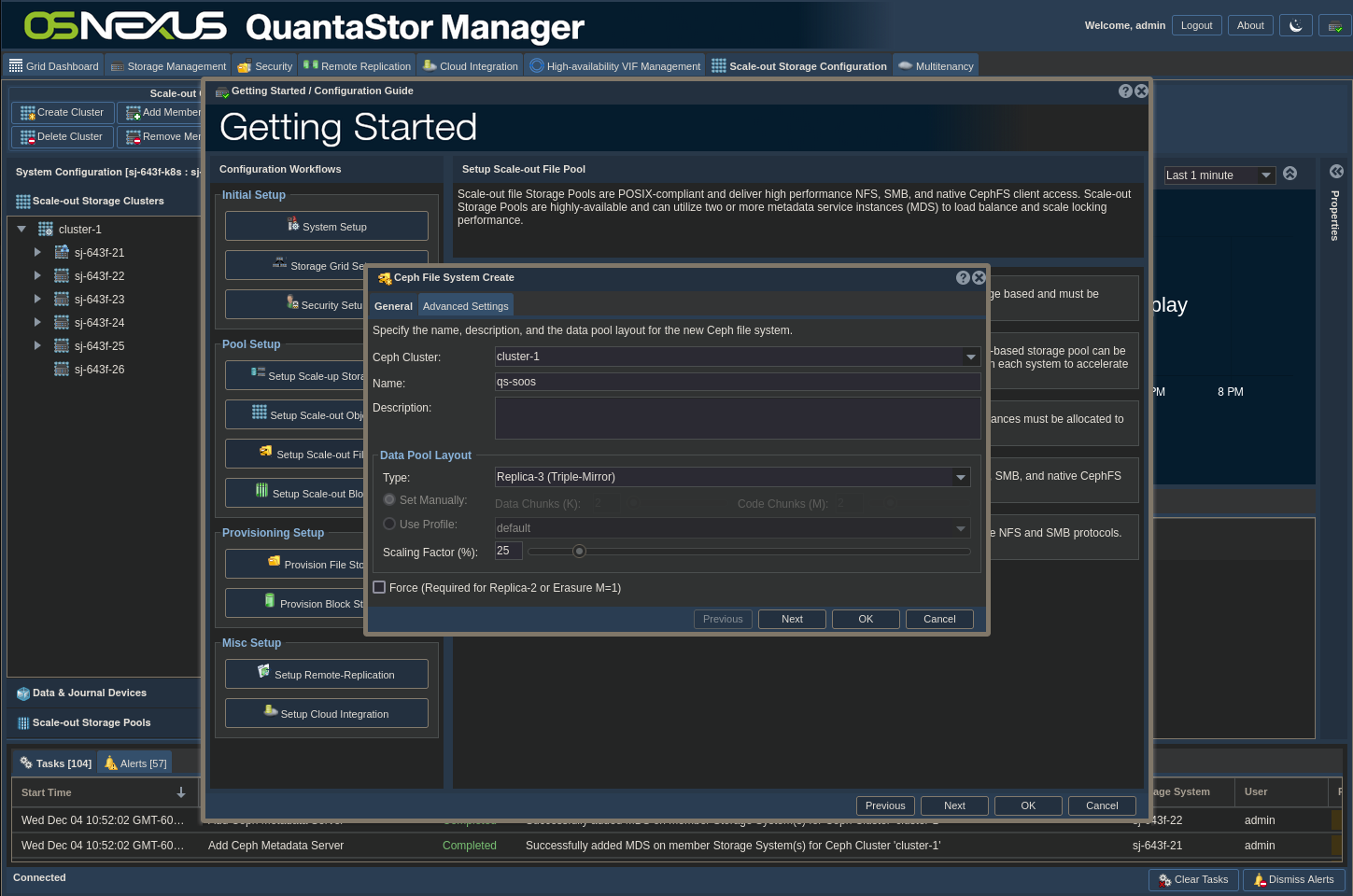 an Enterprise-grade Software Defined Storage platform that turns standard servers into multi-protocol, scale-out storage appliances and delivers file, block, and object storage. OSNexus has made managing enterprise-grade, performant scale-out storage (Ceph-based) extremely simple in QuantaStor, and able to be done in a matter of minutes. The differentiating Storage Grid technology makes storage management a breeze. For the purposes of this exercise we’ll be using QuantaStor’s Scale-out File Storage for file-level storage volumes (cephfs) as opposed to block-level storage volumes (rbd) which are also possible.