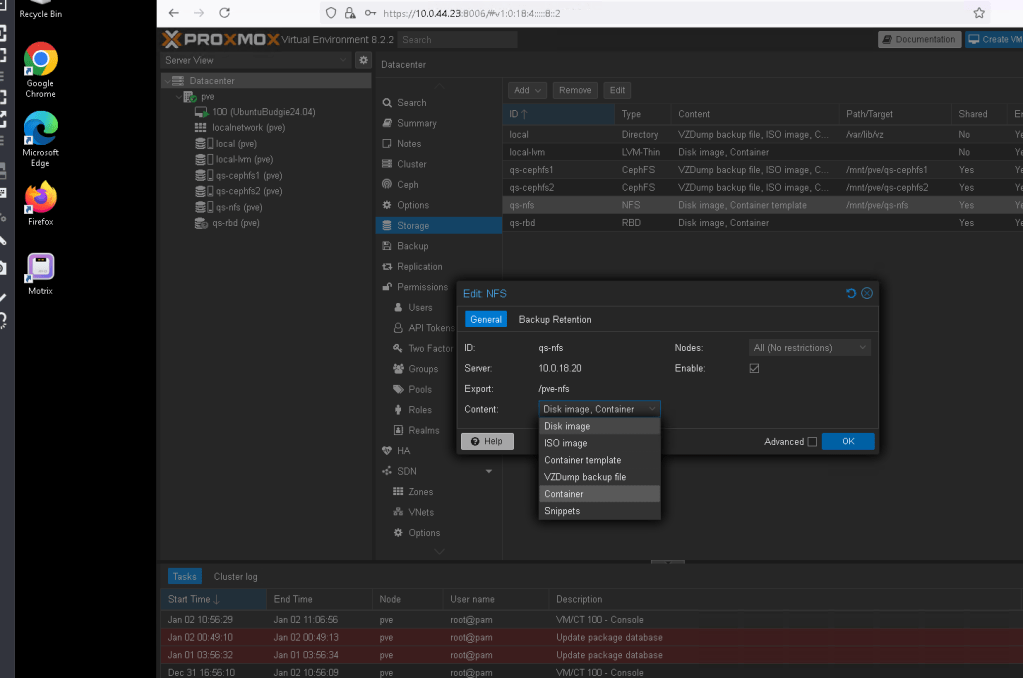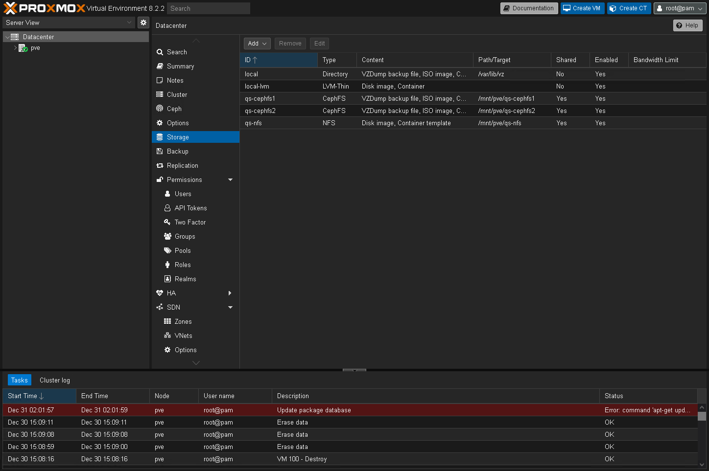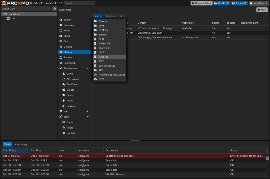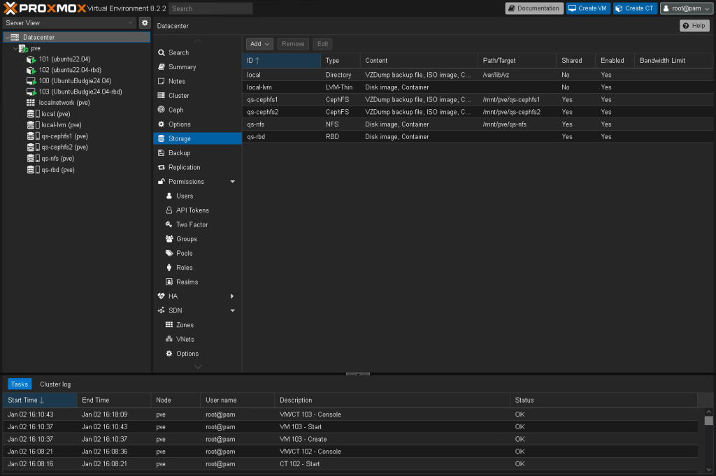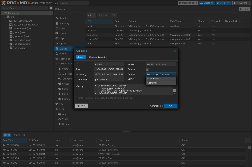 So in a nutshell, NFS and RBD can be used as the disk storage that backs virtual machine and container disk volumes, while CephFS can only be used for media, templates and backup files – not for disk volumes for running systems.