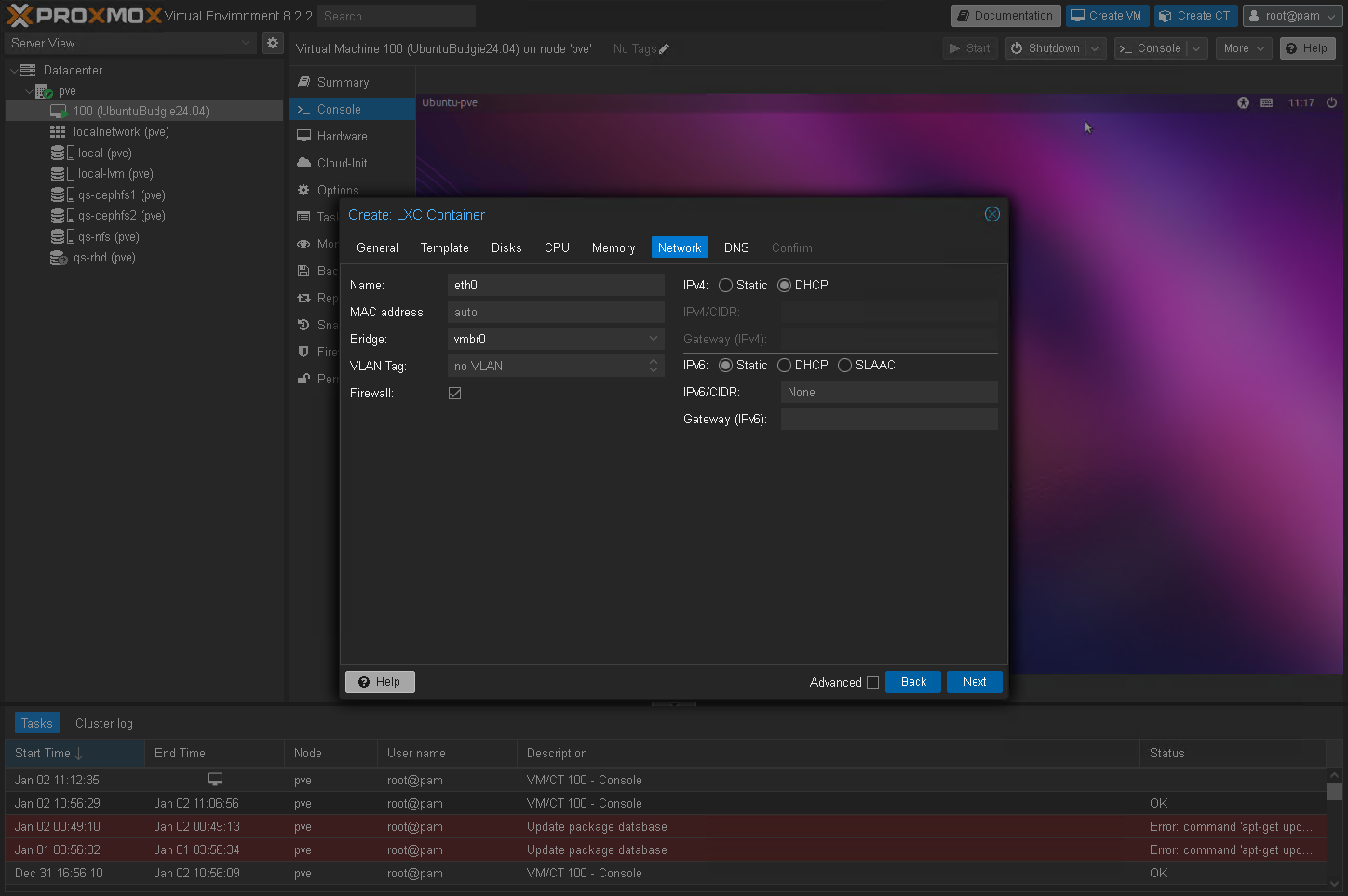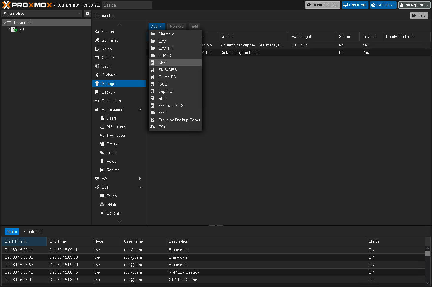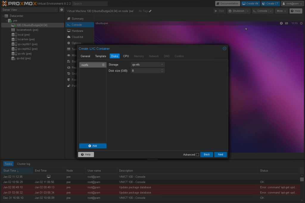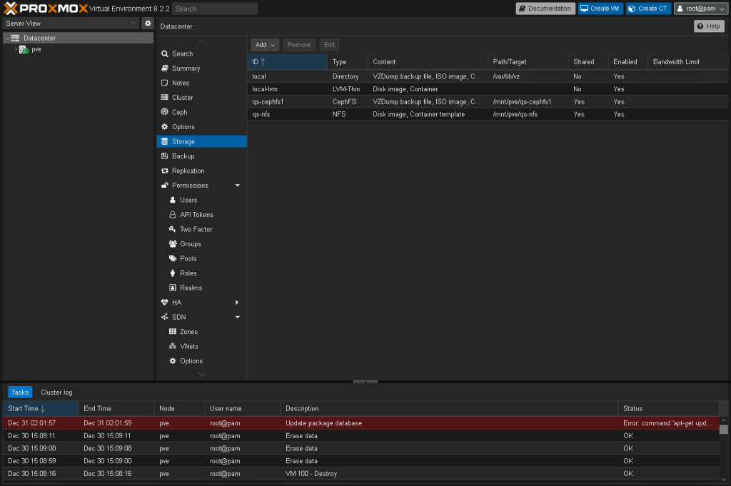 So in a nutshell, NFS and RBD can be used as the disk storage that backs virtual machine and container disk volumes, while CephFS can only be used for media, templates and backup files – not for disk volumes for running systems.