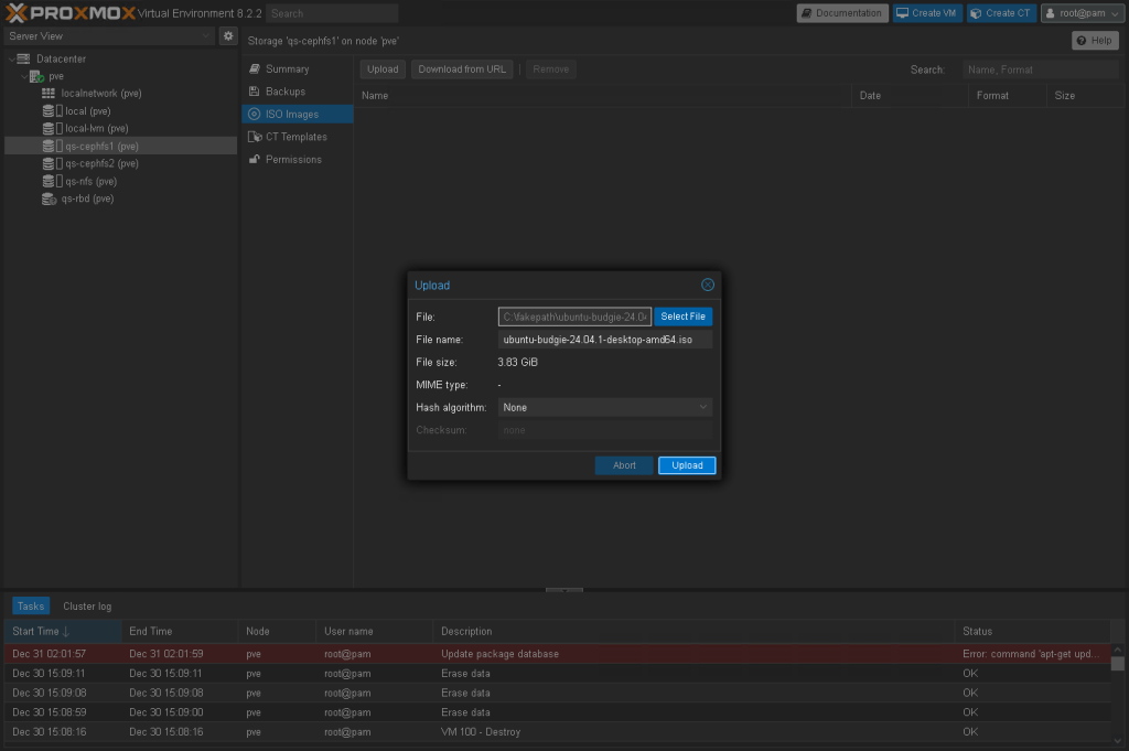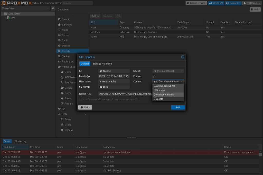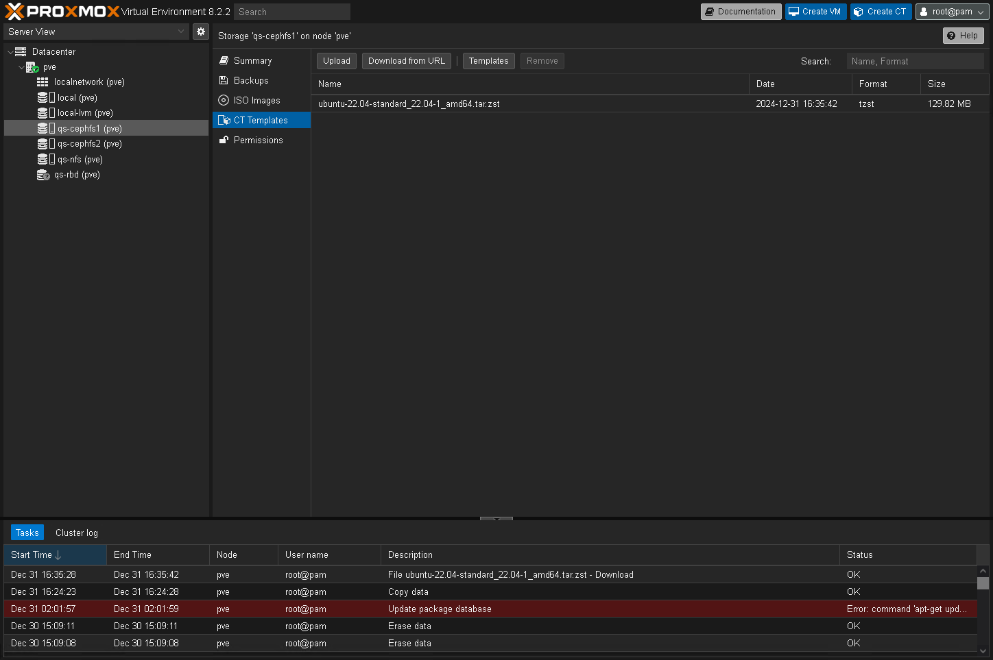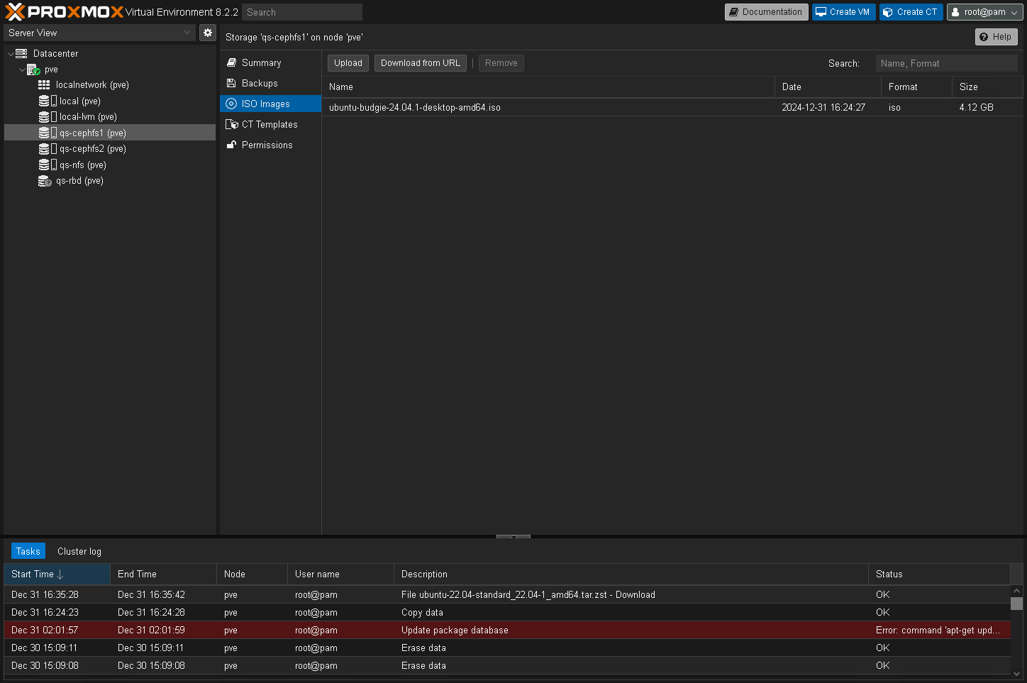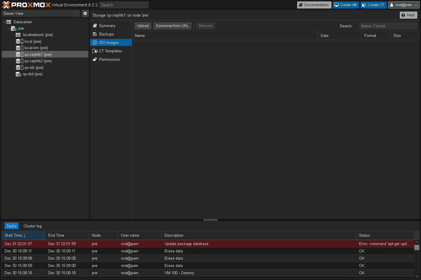- Created at least one CephFS storage pool for storing ISO images and container templates