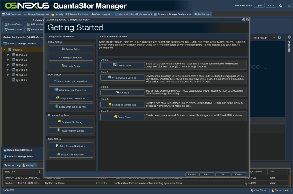 ACTION: Click Setup Scale-out File Pool in the left pane of the dialog. For the first part of this article we’ll be connecting to a QuantaStor Scale-out File Storage pool from Proxmox with their NFS and CephFS storage types.