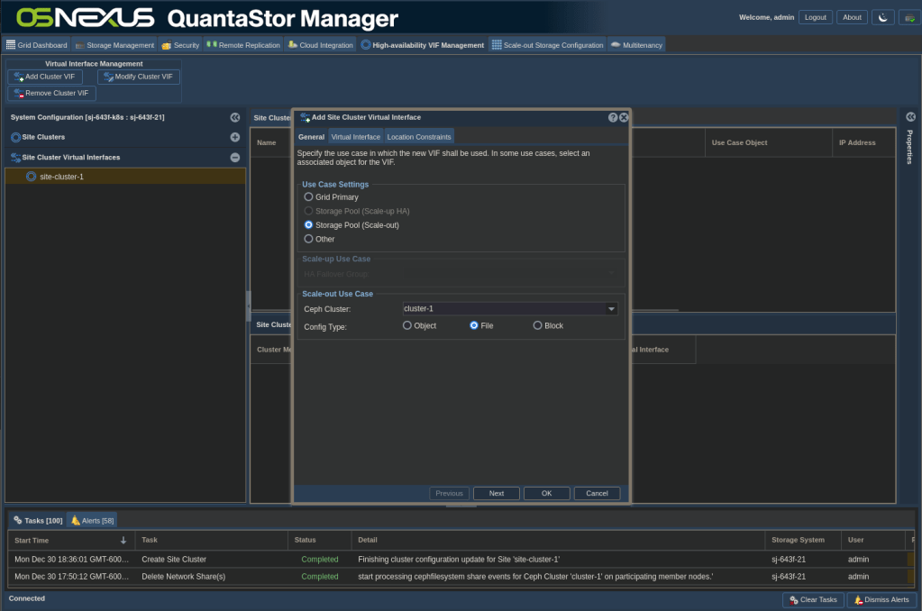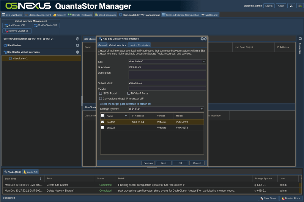 ACTION: This activity will take some time to complete so wait until the Creating Site Cluster Virtual Network Interface task is complete in the Tasks Pane. Once complete, click the Storage Management Context Tab and you’ll see the new VIF listed in the Main Content Pane. Note that it can be on any of the nodes and should that node fail it will be moved to another node to achieve high availability. In my case it resides on sj-643f-24.