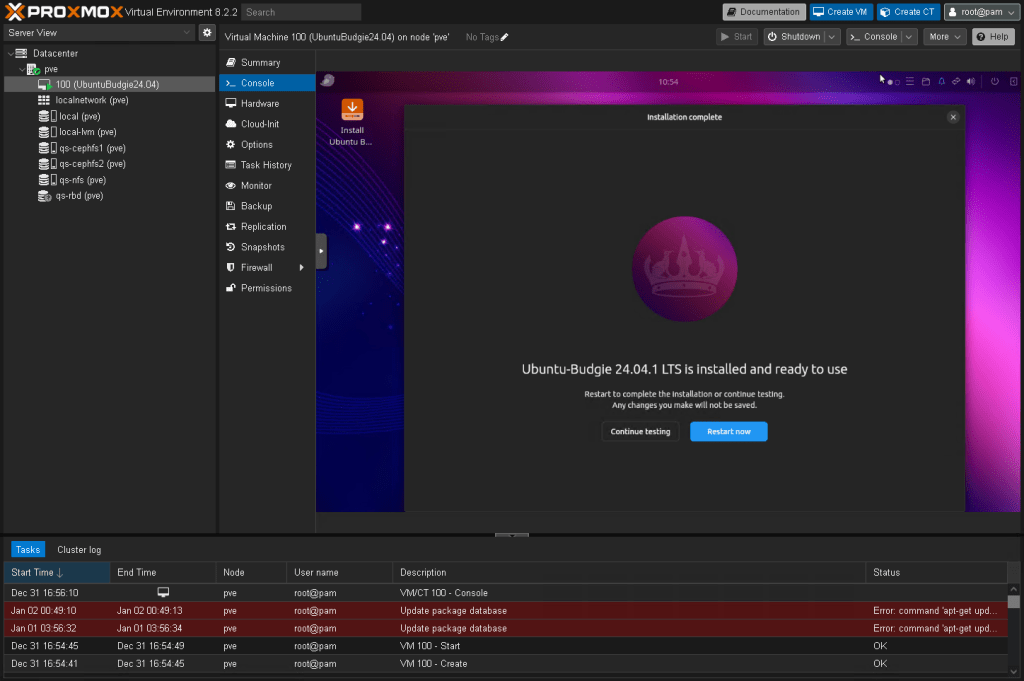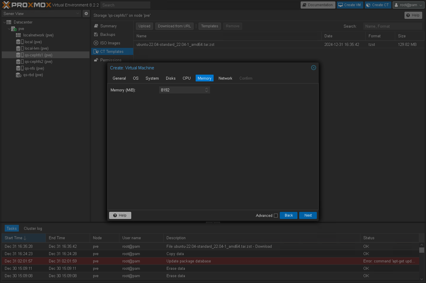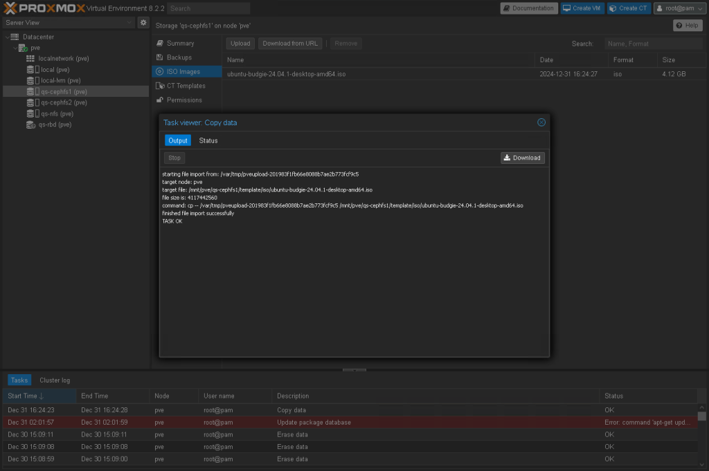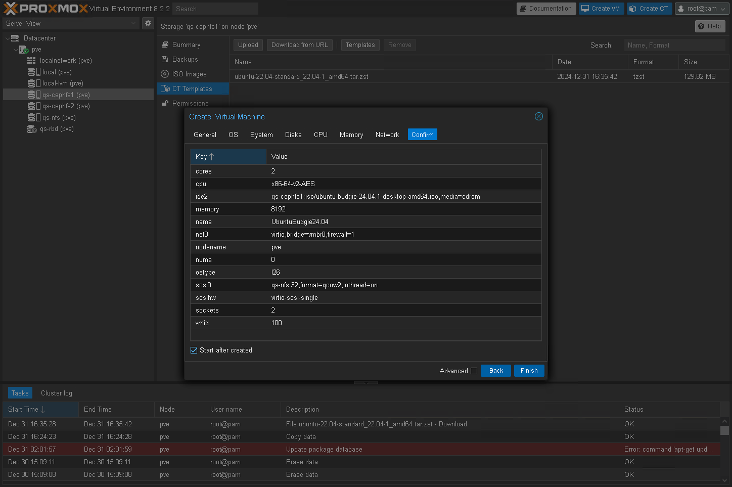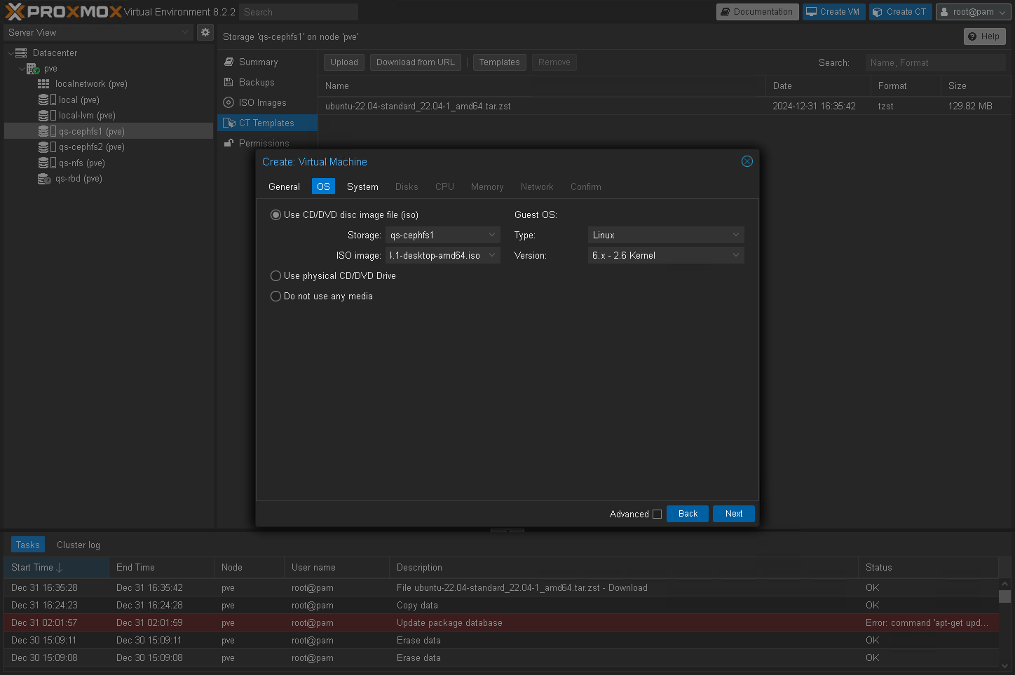 - Created a VM using the RBD (replica) pool storage with an ISO image from the CephFS pool