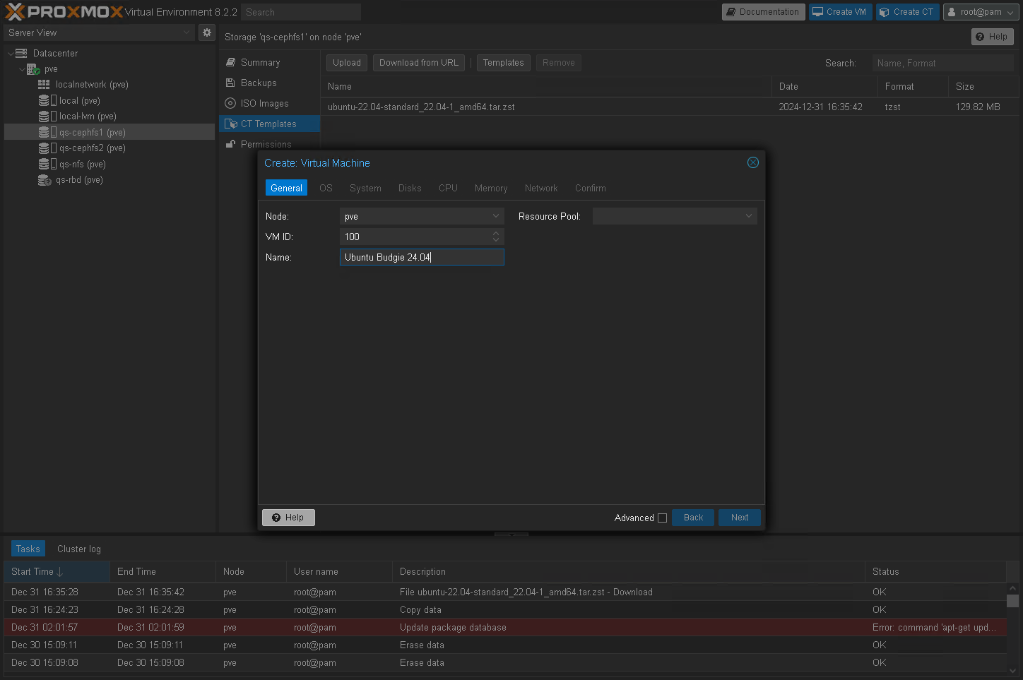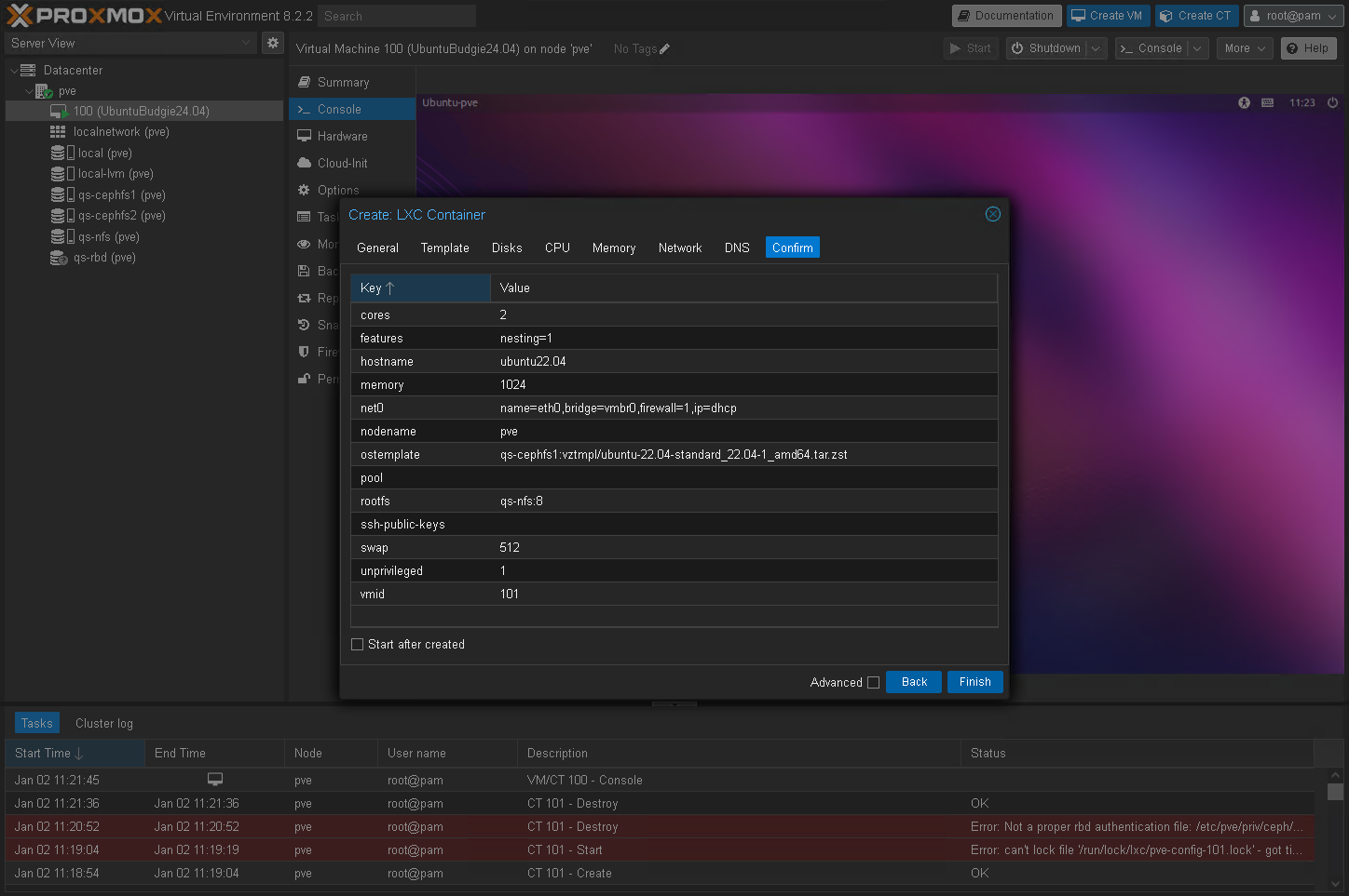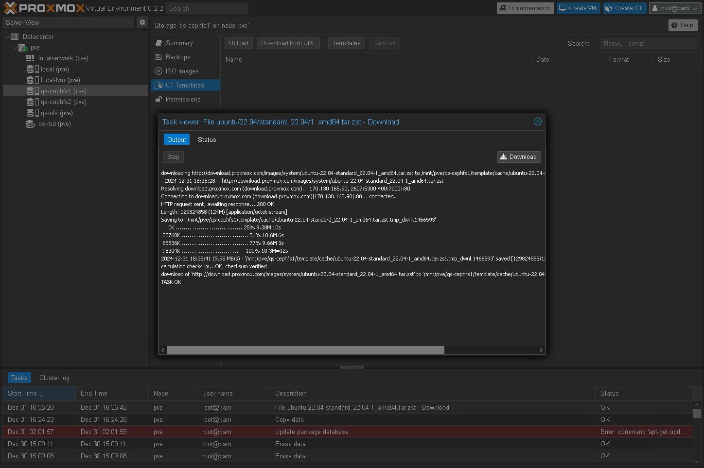 - Created a container using the RBD (erasure) pool storage with a template from the CephFS pool