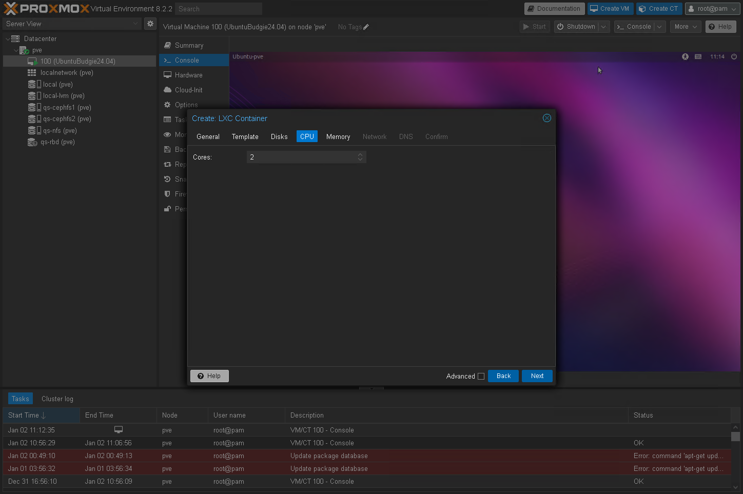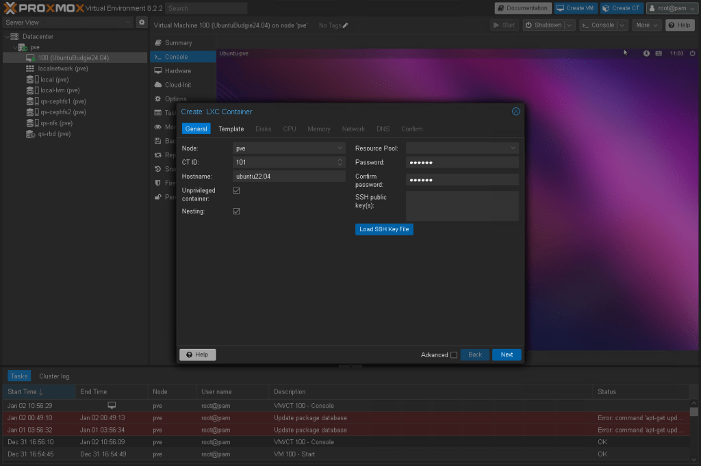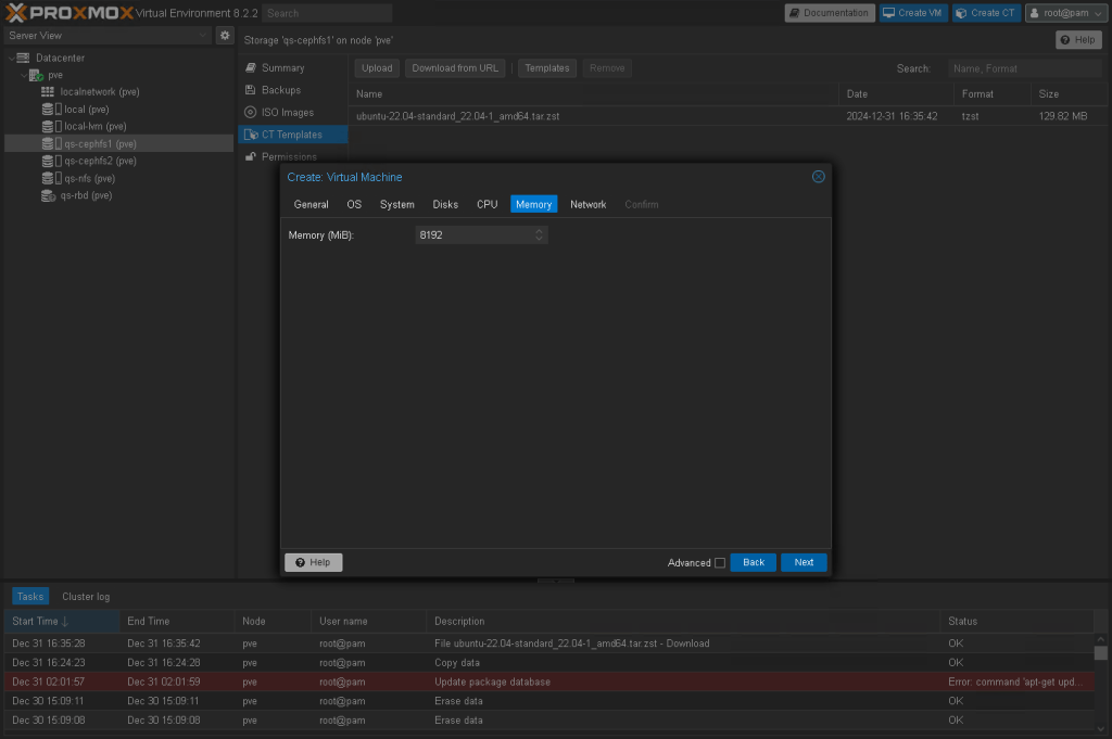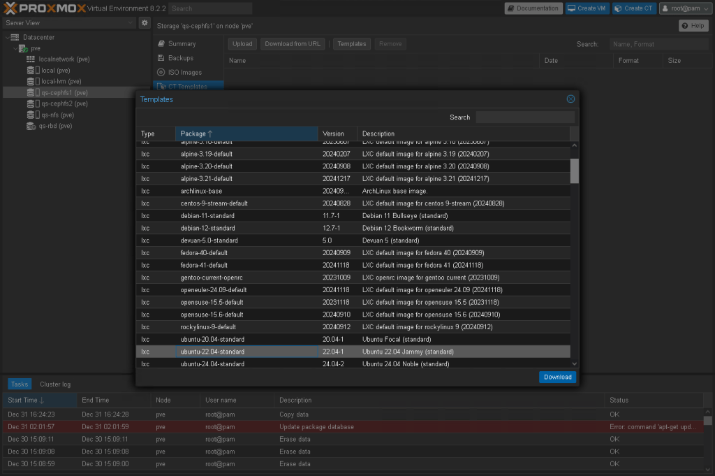 - Created a container using the RBD (erasure) pool storage with a template from the CephFS pool