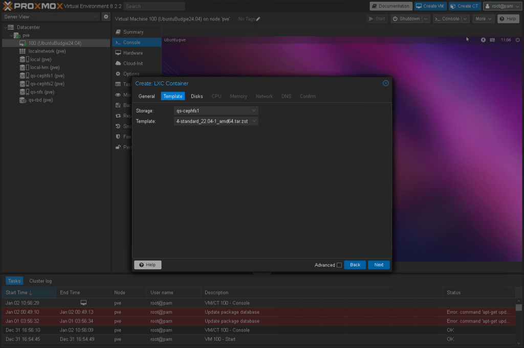 - Created a container using the NFS pool storage with a template from the CephFS pool