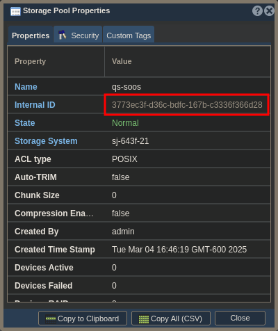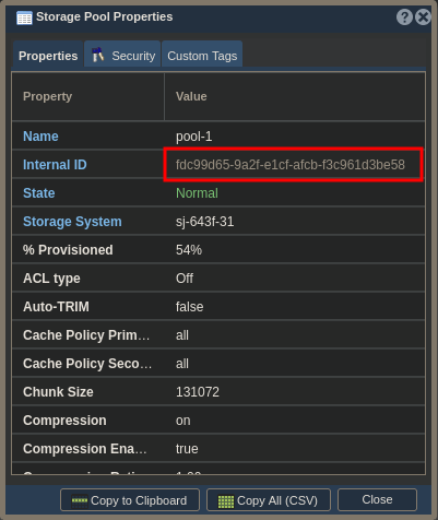 - Note the Internal ID in the dialog box. Mine is fdc99d65-9a2f-e1cf-afcb-f3c961d3be58. Note that unlike the Ceph configuration below, you DO NOT prefix the Internal ID with “qs-” for use in the cinder.conf file.