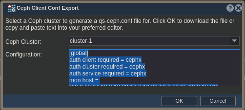 In the Ceph Client Conf Export dialog, select the cluster you’re working with and then highlight and copy the contents of the Configuration field.