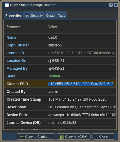 - Note the Cluster FSID field in the dialog box. Mine is e19fc559-35b3-610a-0f3f-d3b4d612c6e9. Highlight that value and copy it.