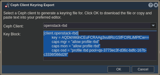 In the Ceph Client Keyring Export dialog, make sure you select the user you just created and then highlight and copy the contents of the Key Block field.