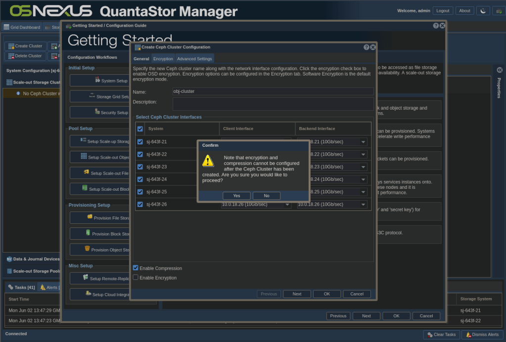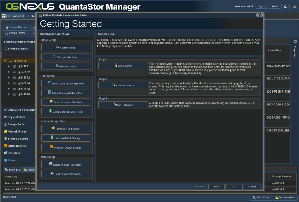 The “Getting Started / Configuration Guide” button at the top right of the UI will be your friend through this process as I will navigate back to it repeatedly while configuring QuantaStor. Depending on the size of your monitor, you could leave the Getting Started dialog up for much of the time and know when to proceed when the activities in the Tasks Pane complete. If the Tasks Pane is obscured by the Getting Started dialog, feel free to close it and re-open it when directed. Past that, we will be bouncing around the Context Tabs later as well.