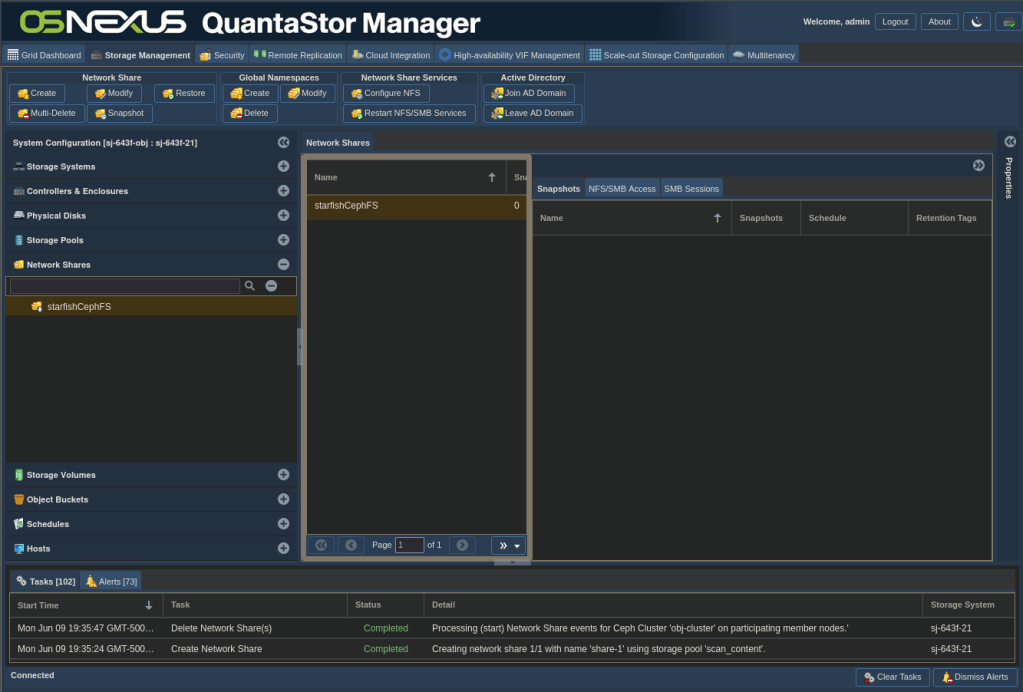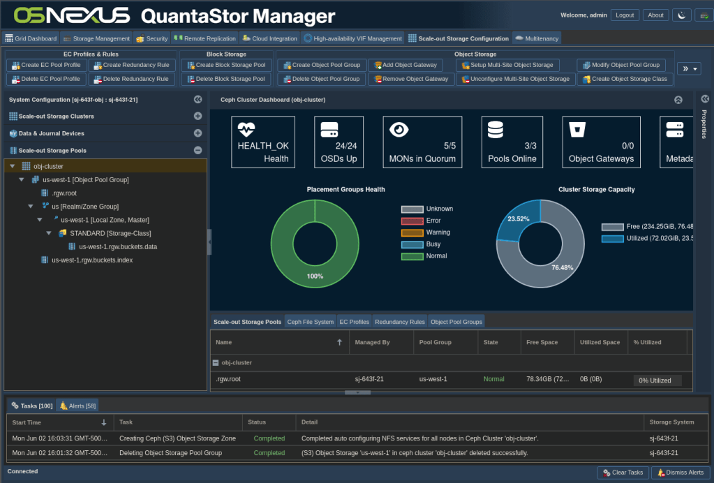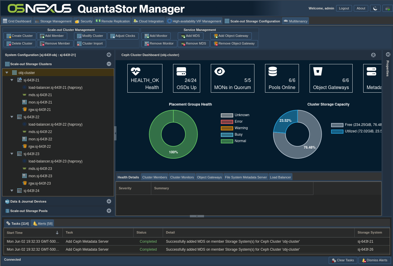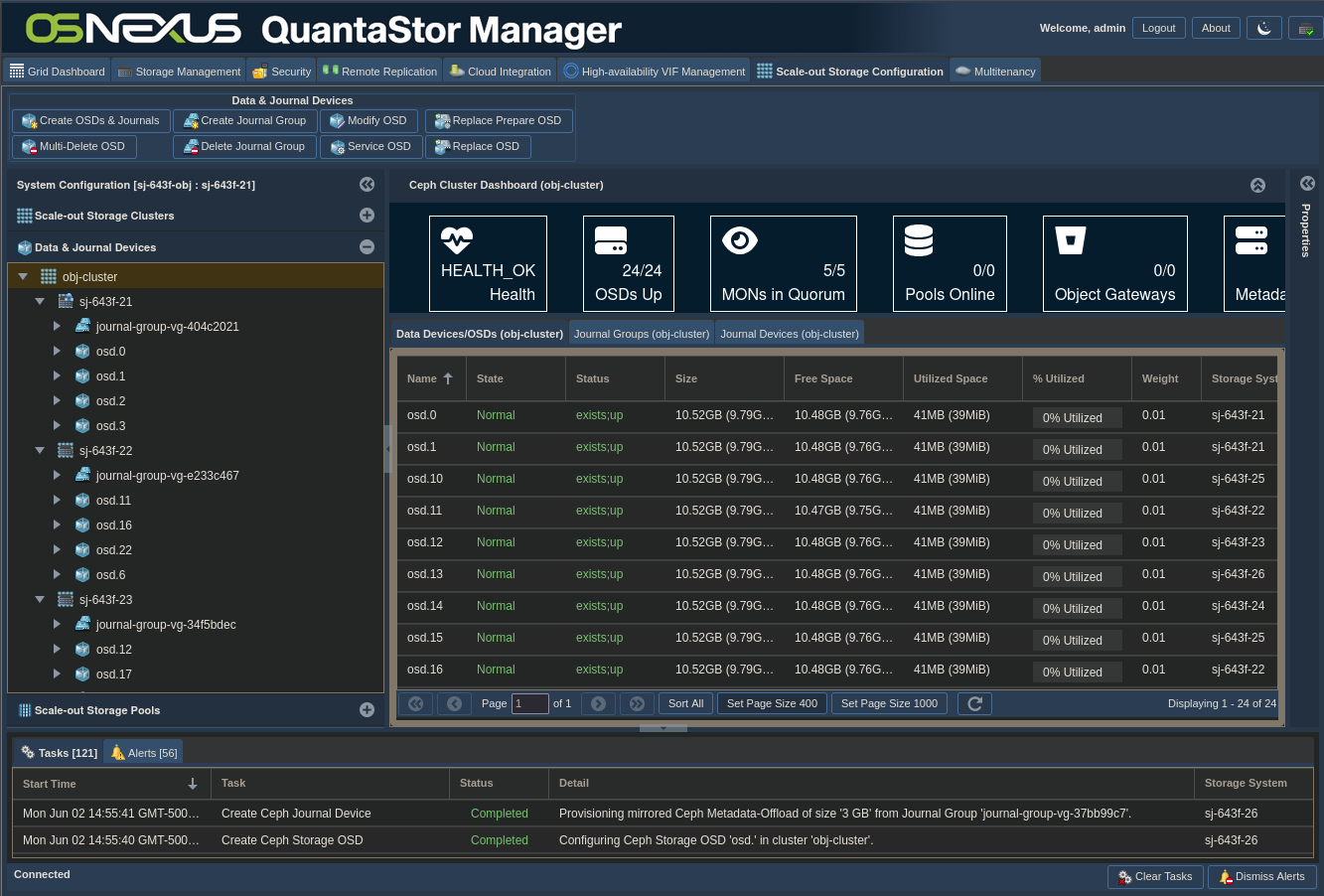 … an enterprise-grade Software Defined Storage platform that turns standard servers into multi-protocol, scale-out storage appliances and delivers file, block, and object storage. OSNexus has made managing enterprise-grade, performant scale-out storage (Ceph-based) and scale-up storage (ZFS-based) extremely simple in QuantaStor, and able to be done quickly from anywhere. The differentiating Storage Grid technology makes storage management a breeze.