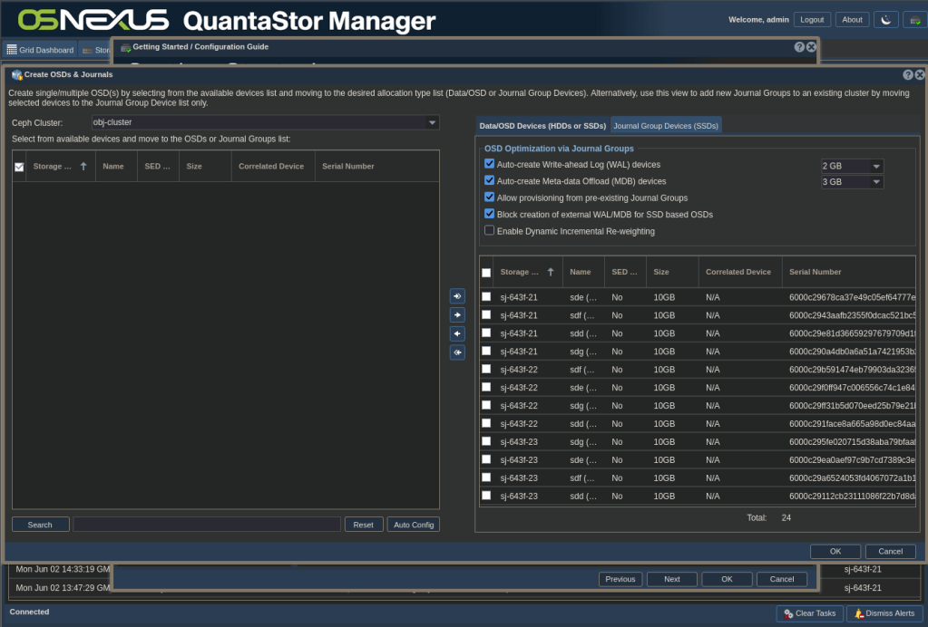 - Clicking the “Auto Config” button at the bottom of the left pane will separate the devices to be used as OSD devices and Journal devices based on the characteristics of the devices