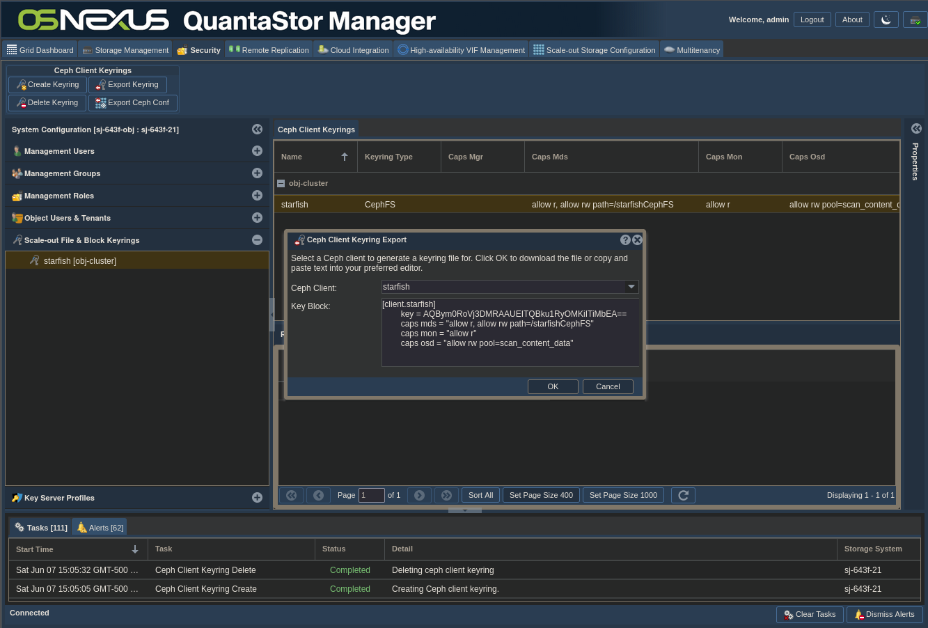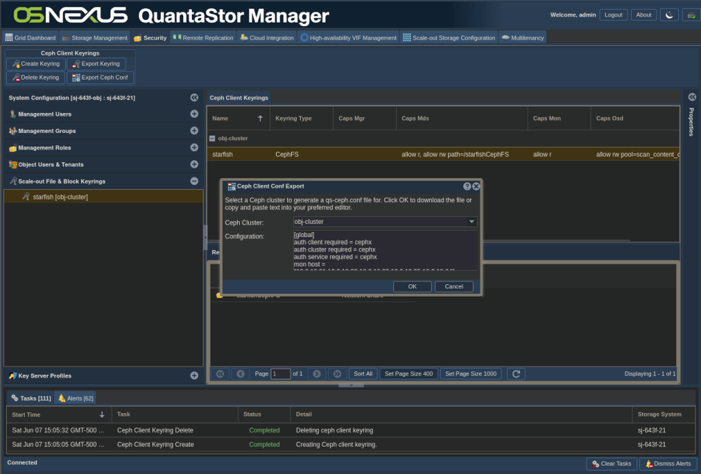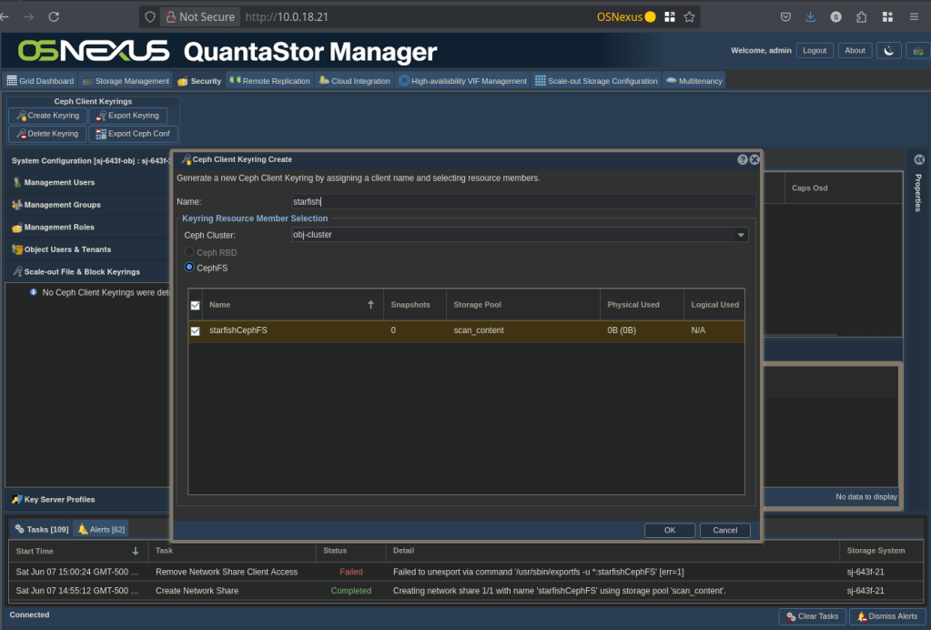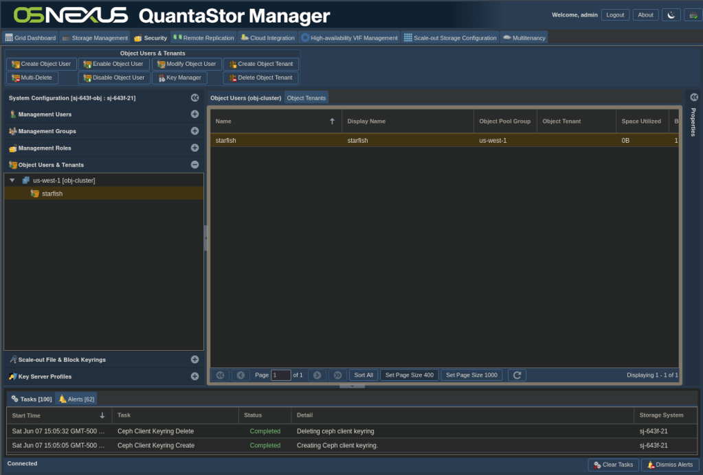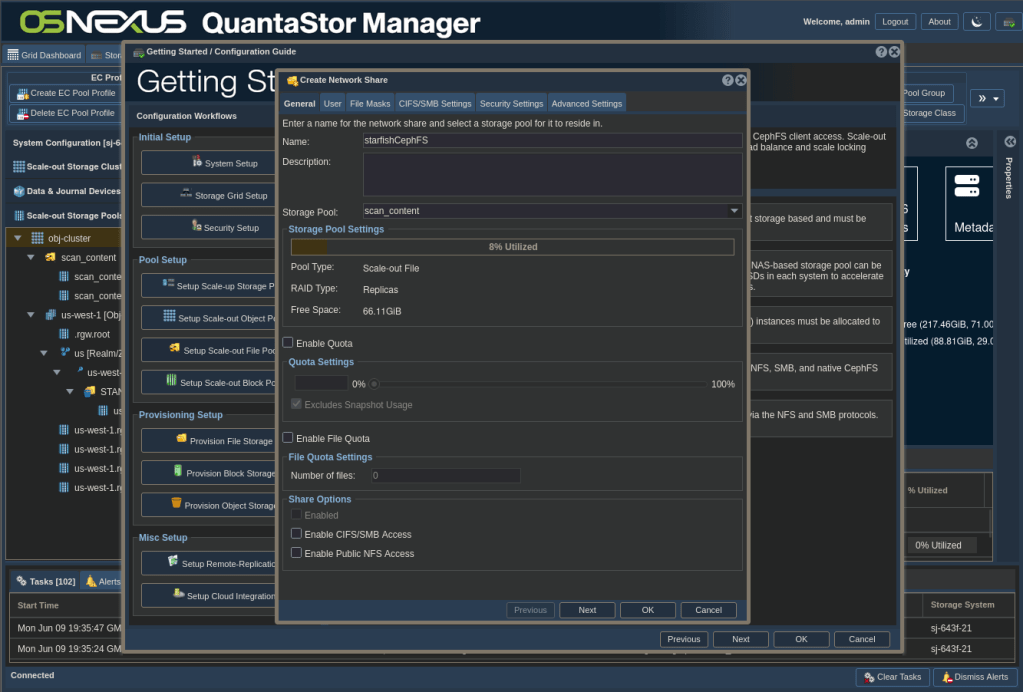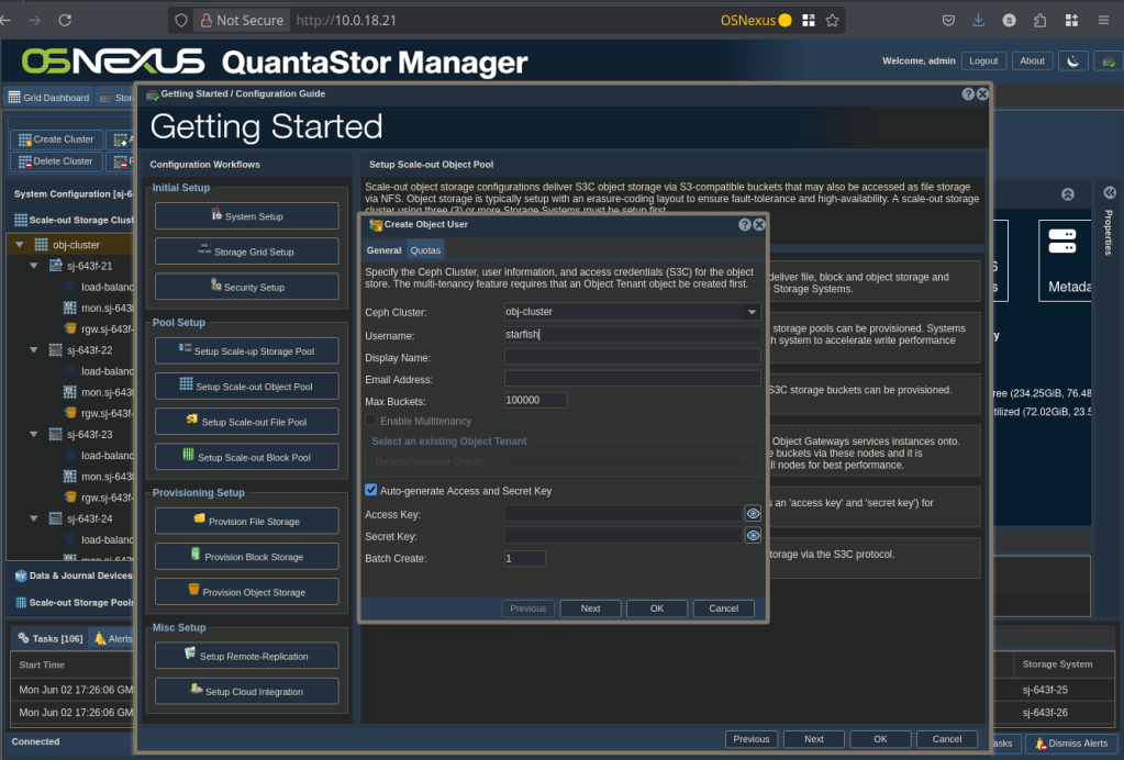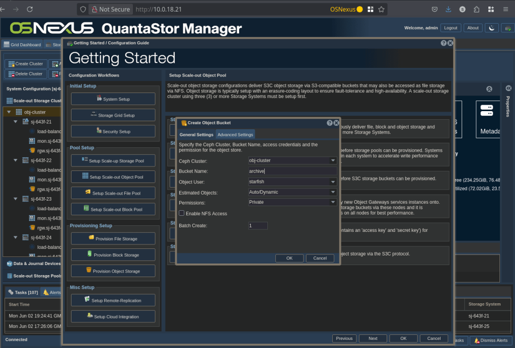 In this post I’ll be standing up Starfish and using it with QuantaStor in two ways. First, I’ll set up QuantaStor Scale-Out Object Storage to use it as, what Starfish calls, an Archive Target, allowing administrators to archive content to an Amazon S3-compatible object storage bucket. Second, I’ll set up QuantaStor Scale-Out File Storage and fill it with some content for Starfish to analyze. Starfish can scan anything that can be mounted to a node running the Starfish agent, and in this case I’ll be mounting the Scale-Out File Storage to the Starfish server itself using CephFS. Finally, I’ll run through a Starfish install and configure it to use the QuantaStor aspects we configured.