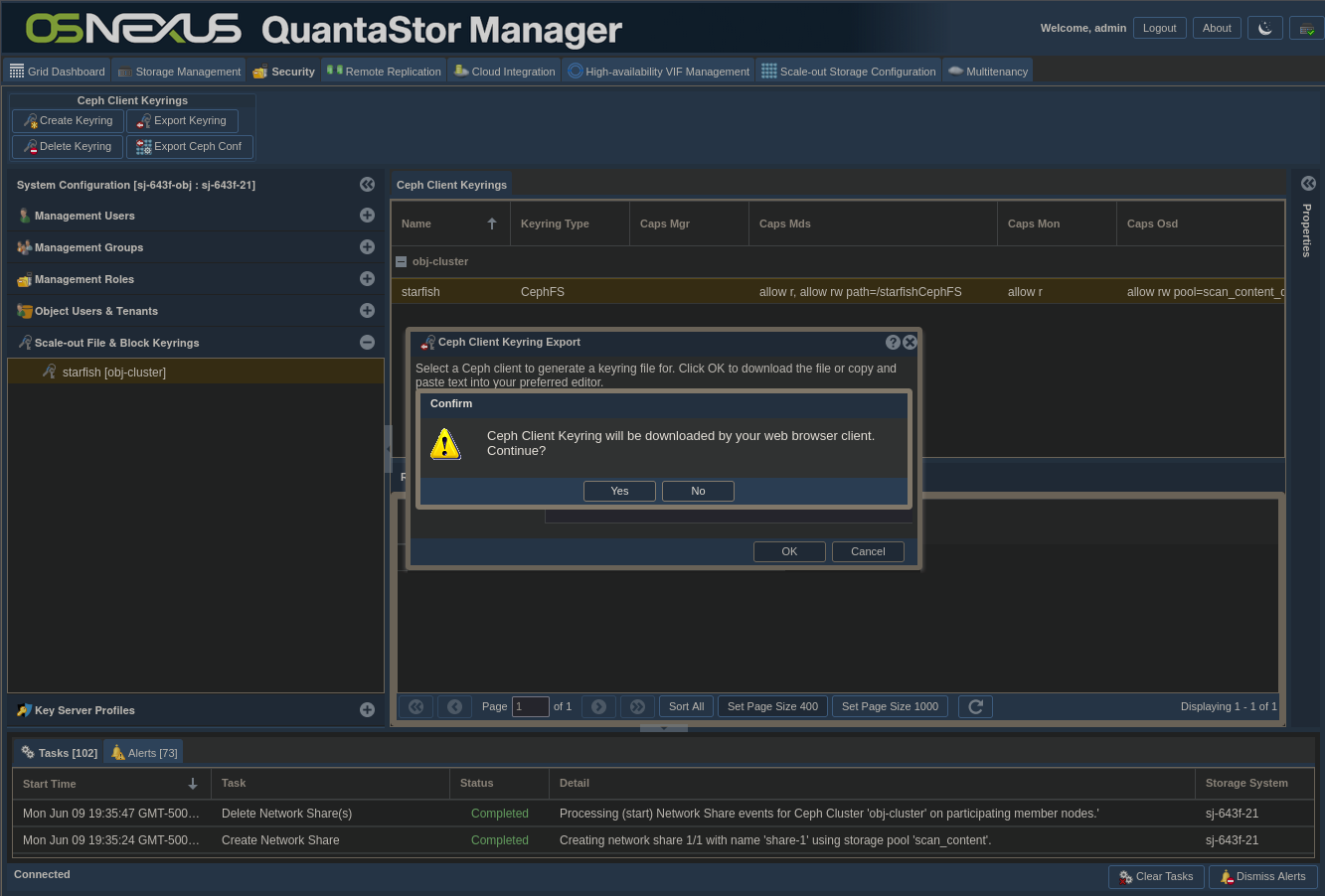Pretty easy install. Now, before leaving the CLI we need to do a couple things. First, remember those two files we downloaded during the storage config? We need to use those on the Starfish node. I used SCP to push them to /home/qadmin. After you get them there we need to mount our Scale-Out File Storage to the Starfish node using CephFS.