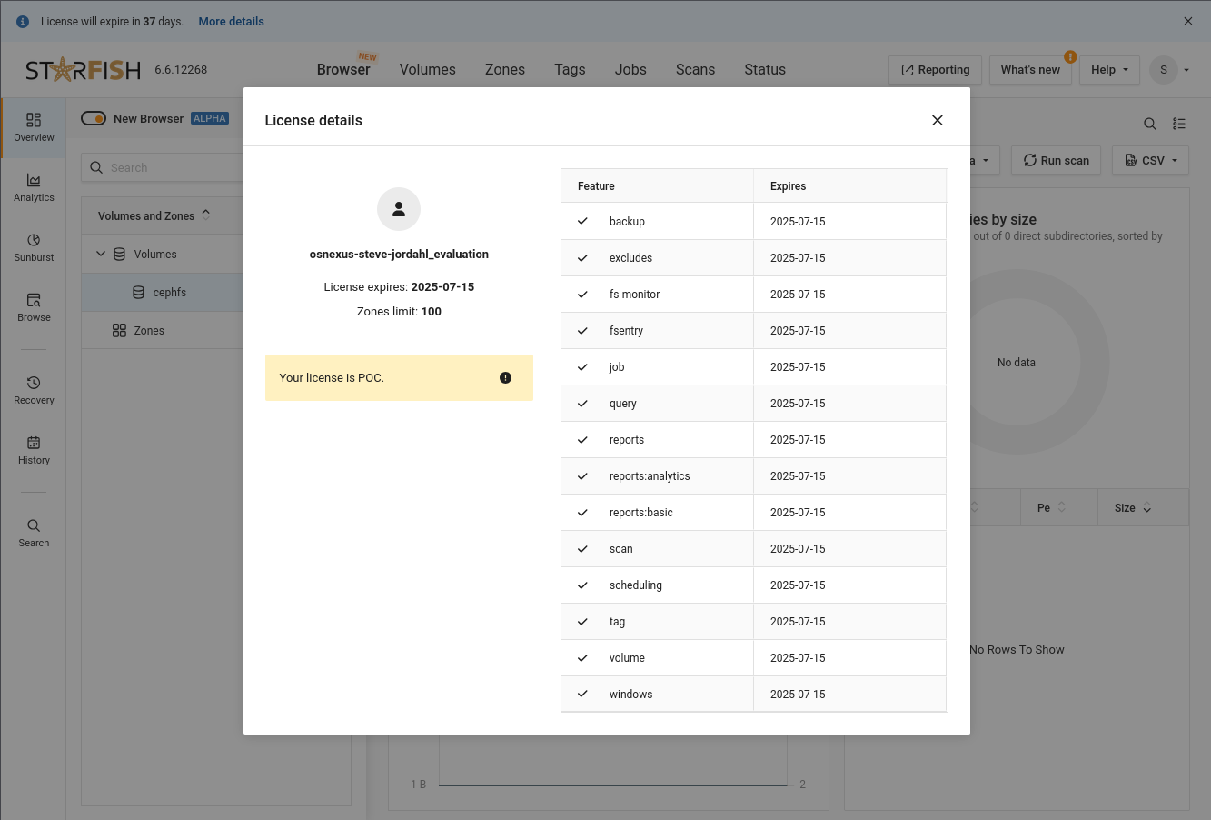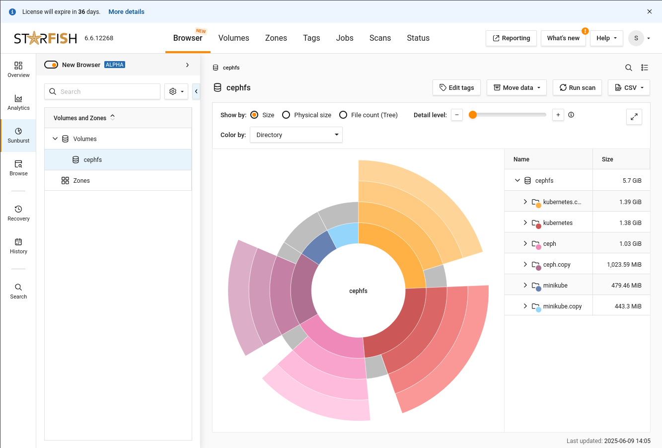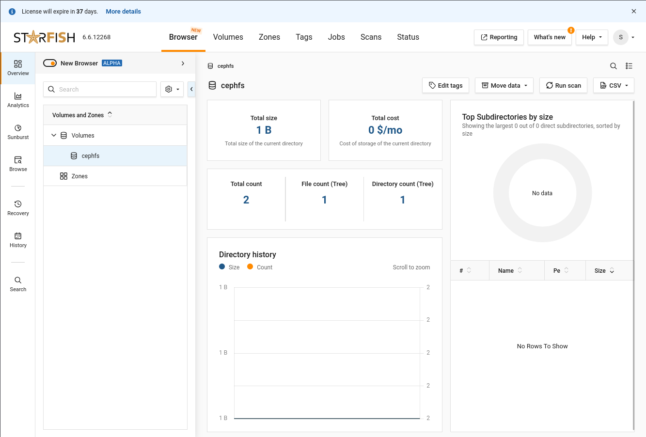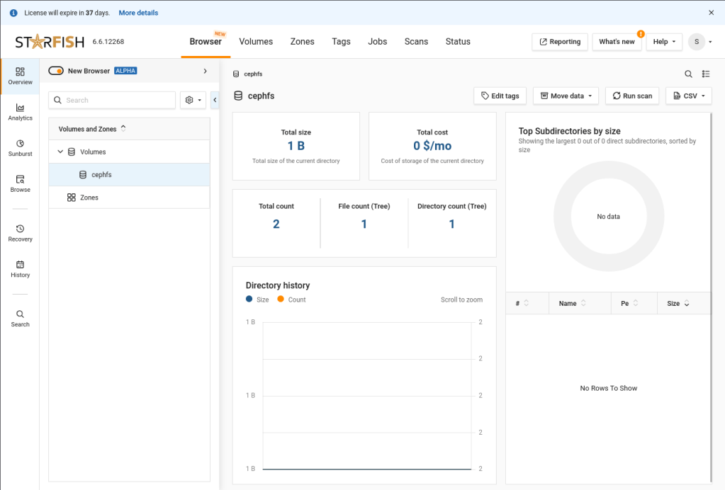 And that’s it. We’ve completed configuring Starfish to use QuantaStor Scale-Out Object Storage and Scale-Out File Storage. Here’s a shot of one of the analytics screens after the CephFS scan.