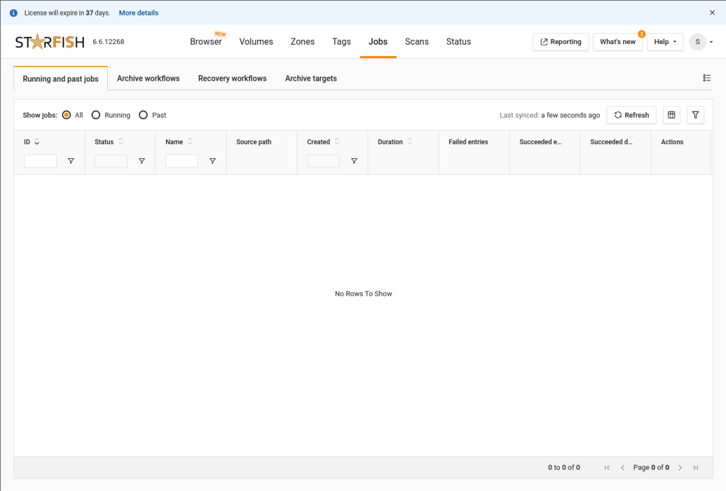 root@sf01:/home/qadmin/starfish# ./install-Starfish.sh Verifying archive integrity... 0% 40% 80% 100% All good. Uncompressing install-Starfish.sh 0% 40% 80% 100% … Running installation script: install-Starfish/install.sh Installer version: 6.6.12186+ffc23bedc7 Did not read installation params from /root/.starfish/installation-defaults: not readable Script called with arguments: /home/qadmin/starfish/install-Starfish/install.sh License keyfile found: /home/qadmin/starfish/20250708.starfish.OSNexus-steve-jordahl_evaluation.keyfile Enter Starfish repository URL provided by Starfish Corporation: https://osnexus-steve-jordahl:REDACTED@repo.starfishstorage.com/basic/starfish_apt/deb/ubuntu Enter host name or IP address (public is recommended) for Starfish to listen on [default=sf01]: REDACTED Starfish database requires ~2GB of storage per 1M files. Enter a local, non-nfs path where database will store its data [default=/opt/starfish/pg/13]: To optimize database performance Starfish needs to know the storage type on which database is placed. 1. HDD 2. RAID (HDD) 3. SSD 4. NVMe Please enter storage type [default=hdd]: 2 Would you like to set up a backup for Starfish database; type yes or no [default=no]: You can configure Starfish to send nightly diagnostic/status reports. Emails may be sent to Starfish support or any custom email to help monitor your installation. A few questions will be asked to configure those emails and their contents. All the following options can be modified later by editing /etc/default/starfish. Would you like nightly diagnostic/status reports to be sent to Starfish support?; type yes, no or obfuscated [default=yes]: no Would you like nightly diagnostic/status reports (errors only) to be sent to other (internal) recipients? If yes, list the emails here, space separated. Otherwise press enter [default=]: Would you like to set the from address? If so, enter it here, otherwise press enter to use the system default [default=]: Starfish installer installs Redash to provide data visualizations. Enter username (Redash "email address") used to log in to Redash [default=starfish@starfishstorage.com]: Enter password used to log in to Redash [min len=6, default=GzbVkgf8XSmOZaB5bb71]: Confirm redash password [min len=6, default=GzbVkgf8XSmOZaB5bb71]: Would you like to enable backup for Redash database; type yes or no [default=no]: Installing Starfish with the following parameters: sf-repo-url: "https://REDACTED@repo.starfishstorage.com/basic/starfish_apt/deb/ubuntu" sf-misc-repo-url: "(default)" sf-public-repo-url: "(default)" sf-listen-address: "REDACTED" sf-disable-proxy-check: "" sf-db-path: "/opt/starfish/pg/13" sf-db-storage-type: "raid" sf-enable-backup: "no" sf-backup-path: "" sf-backup-retention: "2" sf-enable-diagnostic-reports: "no" sf-diagnostic-reports-to-starfish-team: "no" sf-obfuscated-reports-to-starfish-team: "no" sf-diagnostic-reports-attachments: "yes" sf-diagnostic-reports-extra-emails-errors-only: "" sf-diagnostic-reports-from-email: "" sf-diagnostic-reports-ignored-errors-pattern: "" redash-email: "starfish@starfishstorage.com" redash-password: "*****" redash-enable-backup: "no" redash-backup-path: "" Writing installation params to /root/.starfish/installation-defaults Free disk space for /opt/starfish/pg/13: 105216491520 bytes Adding Starfish public GPG key Selecting previously unselected package starfish-release. (Reading database ... 113528 files and directories currently installed.) Preparing to unpack starfish-release.noble_all.deb ... Unpacking starfish-release (1.3-26.noble) ... Setting up starfish-release (1.3-26.noble) ... ... Configuring Redash Configuring Redash Redash admin user starfish@starfishstorage.com password updated. Redash credentials saved in /opt/starfish/etc/99-local.ini. Configuring Redash Alembic upgrade to head, config file /opt/starfish/alembic/redash/alembic.ini Configuring Redash v10 on address 'http://localhost:5003'... Creating report: Redash Report Generation Status Creating report: Estimate Duplicates Creating report: Volume Stats Refreshing query for visualization: estimate_duplicates.Table Refreshing query for visualization: stats.Table Dashboard 'Starfish Information' URL: http://localhost:5003/dashboards/1-starfish-information Dashboard 'System Dashboard' URL: http://localhost:5003/dashboards/2-system-dashboard Dashboard 'Volume Global Analytics' URL: http://localhost:5003/dashboards/3-volume-global-analytics ###### Starfish Installation is Complete ###### root@sf01:/home/qadmin/starfish#