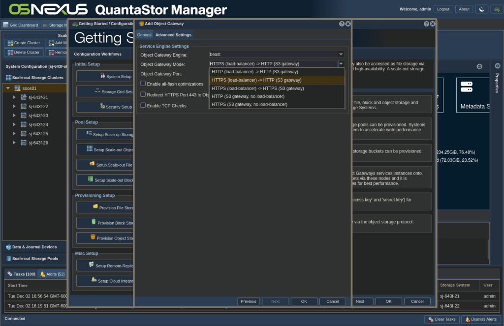 What I WILL NOT be including is the setup of Scale-Out Object Storage with QuantaStor. I’ve done a number of other blogs that already discuss that, so I won’t repeat that in this one. For those that don’t want to jump to other blogs and want to QuickStart the setup of a 3+ node QuantaStor cluster, after installing QuantaStor software on all the nodes, login to the web UI on the first node and click the “Getting Started/Configuration Guide” button in the top-right corner and follow the steps. You’ll have your Scale-out Object Storage set up in no time!