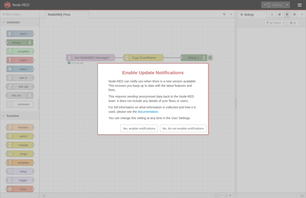 Having a script receive our AMQP messages has value, but it’s not very exciting. The reason to deploy Node-RED with RabbitMQ is because you can visualize the events and start doing something with the messages immediately. Node-RED has close to 6000 “nodes” that you can download and implement; everything from the various SQL flavors to Kafka to OPC U/A. If you want to take your event and push it somewhere else, Node-RED could be a great way to do that. What’s more is that the debugging value from the interface is fantastic! I’ve provided links to Node-RED training below. The first session is an hour long and you’ll be able to start manipulating the data after about 15 minutes.