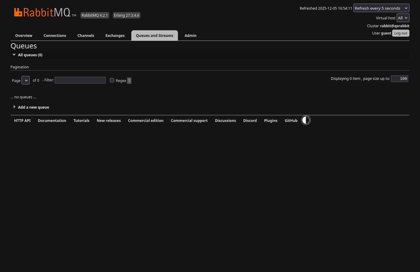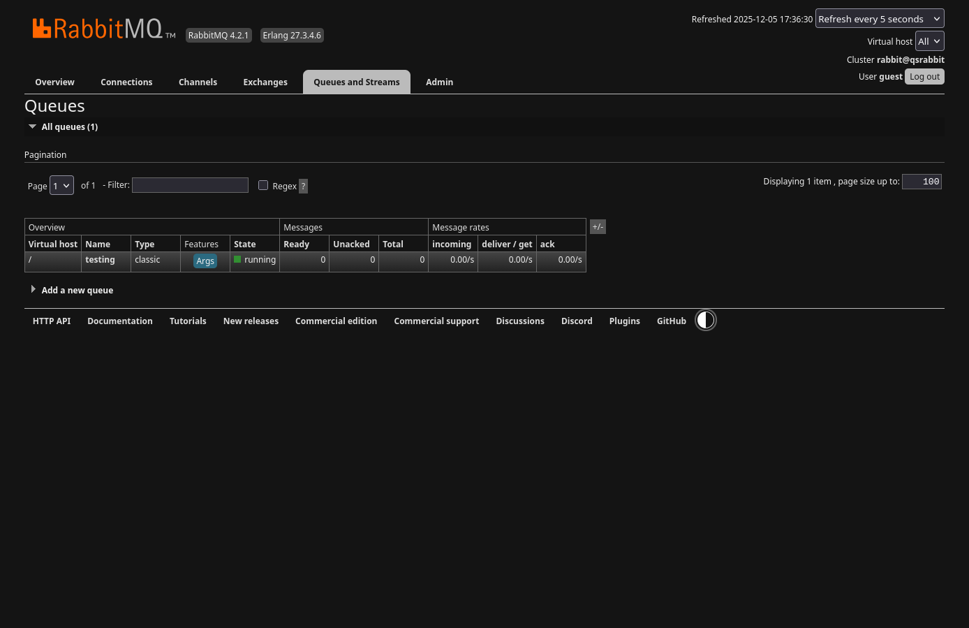 Back in the RabbitMQ interface on the Queues and Streams tab you’ll see this: