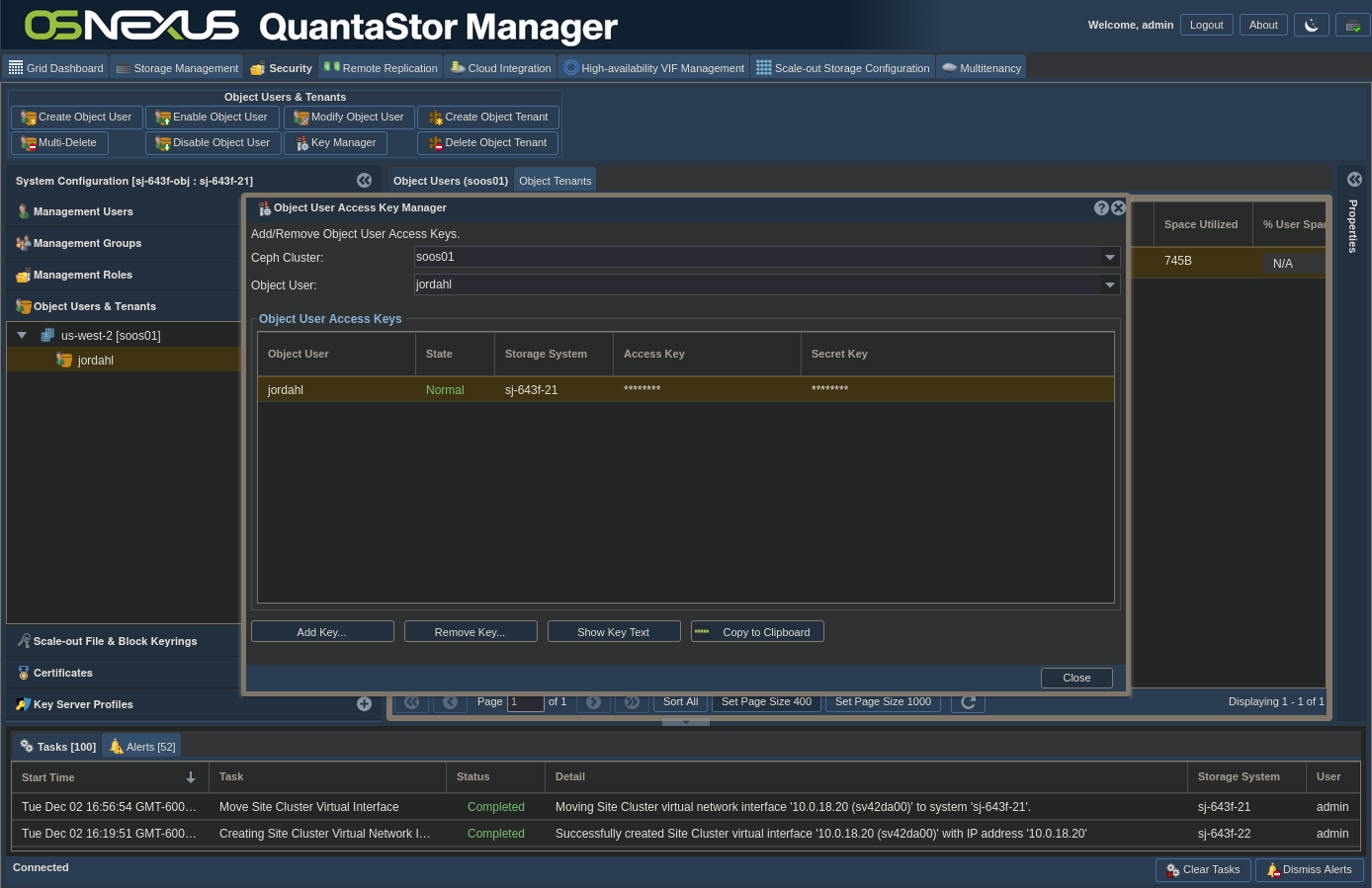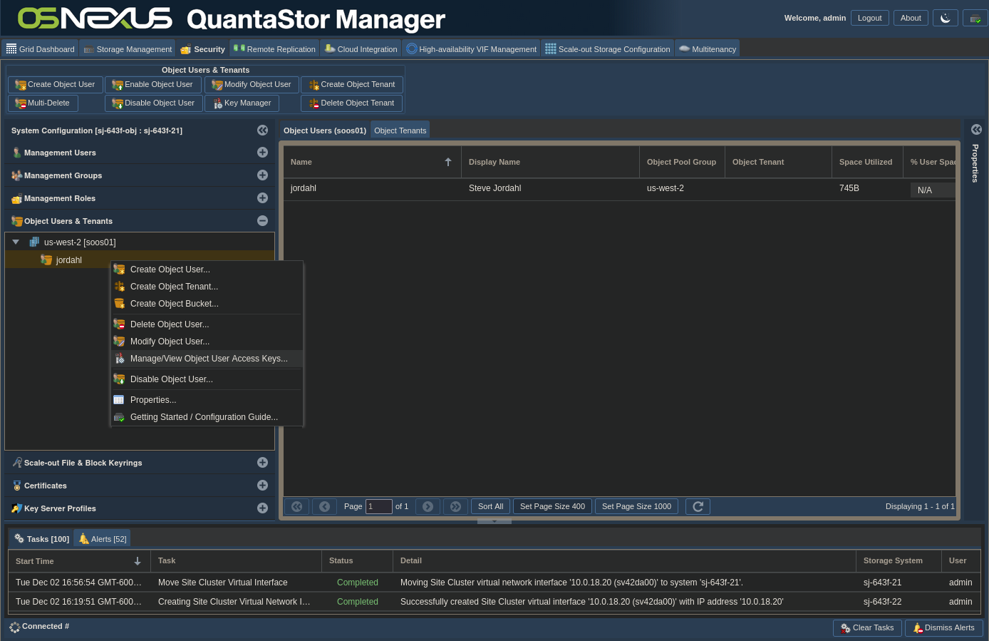 Now that that’s complete, we need to get your credentials for your Ceph user. In the web UI, switch to the Security tab, then Object Users & Tenants. Expand your region and note down what it is as you’ll need to use it shortly. Right-click your user and click Manage/View Object User Access Keys.