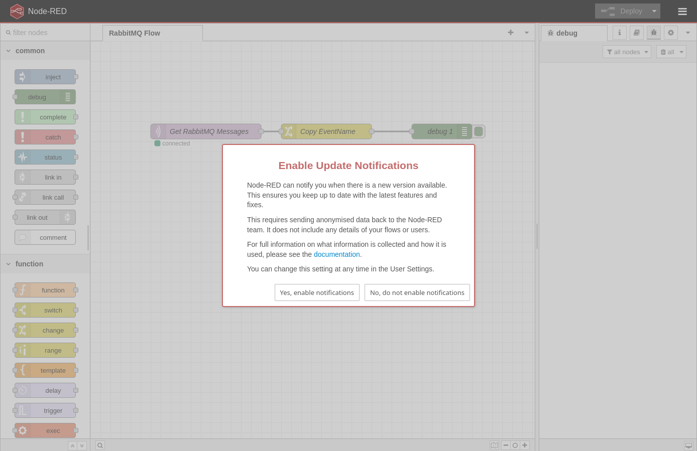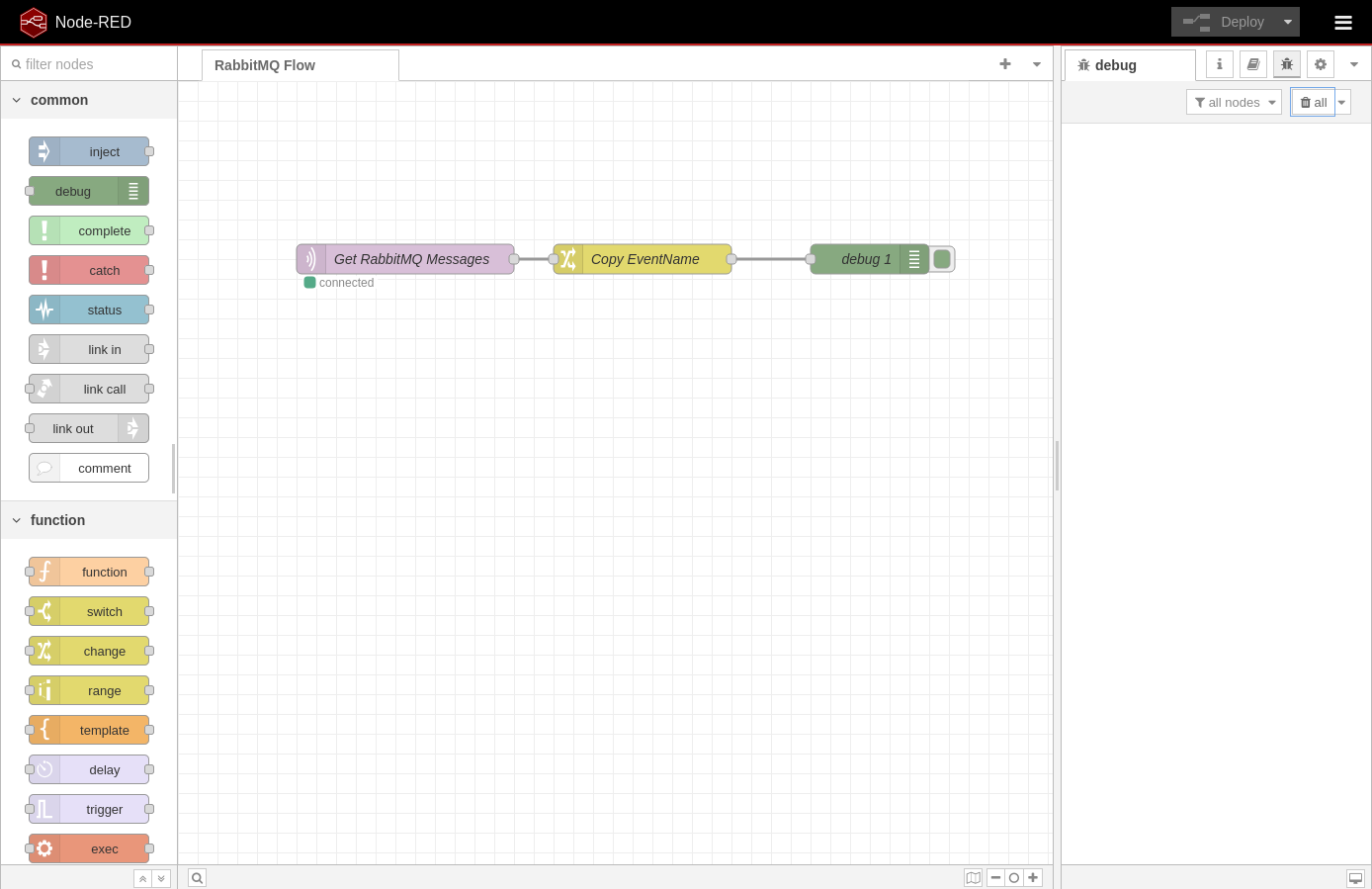 The Copy Event/Name node is a change node found in the function section of the palette. This allows you to alter the message in many ways. For this exercise I decided to copy the eventName, filename and method out of the data and create top-level attributes in the JSON payload. That way we can easily see them in the debug panel rather than having to expand the data.