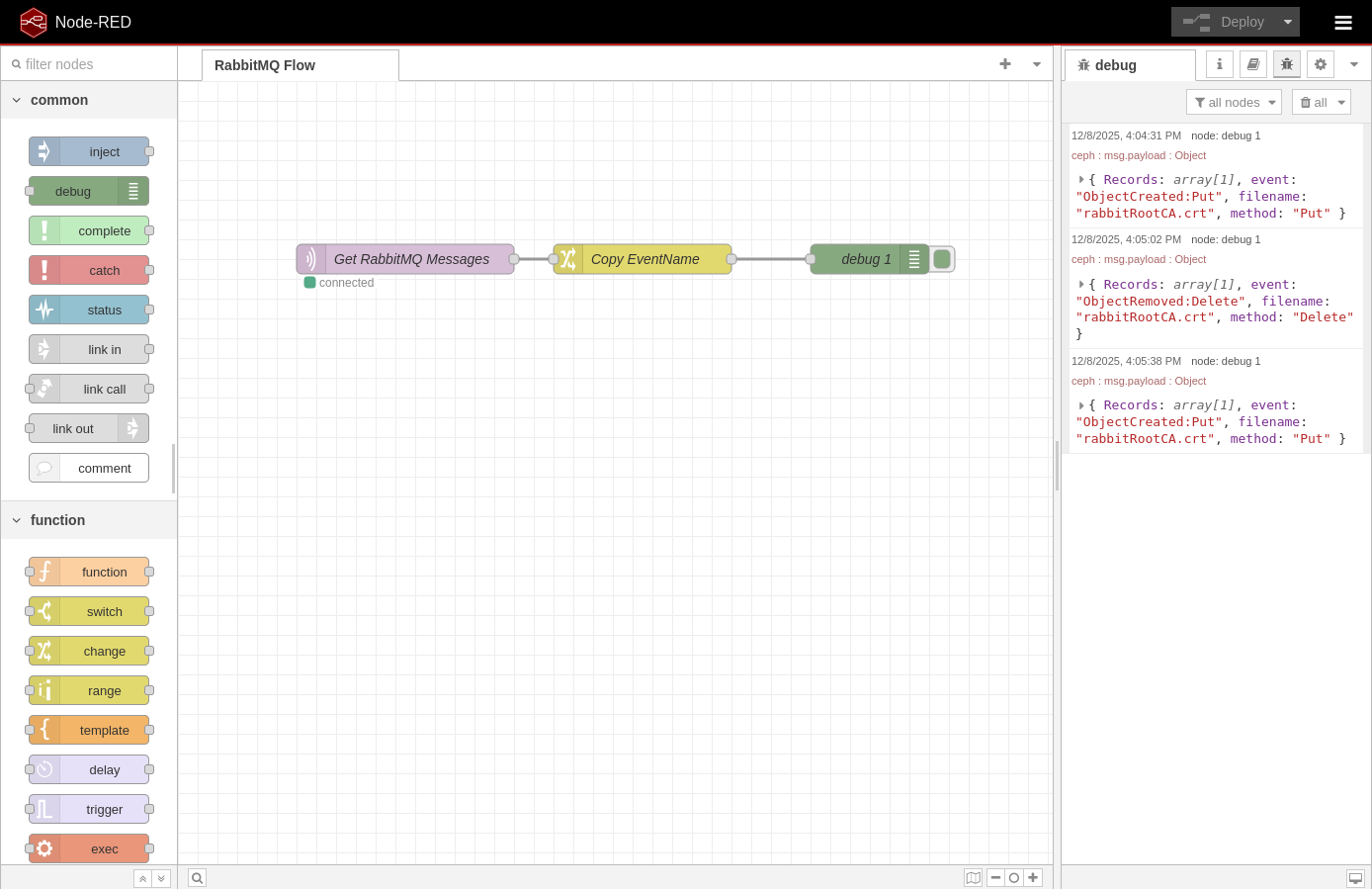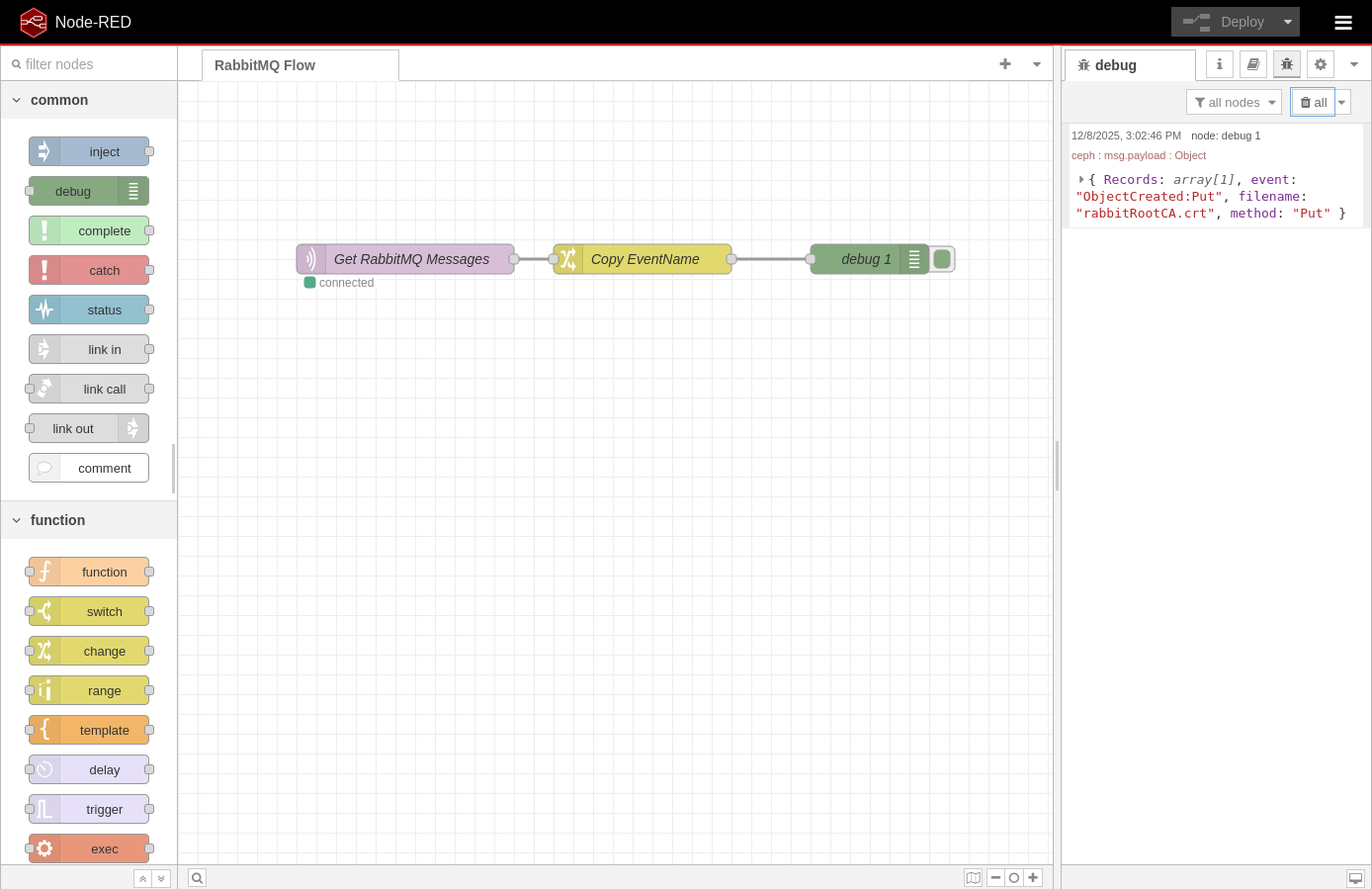 And that’s it. We’re manipulating objects in our object storage bucket and notification events are being sent through RabbitMQ to Node-RED. You now have the tools to play with various configurations and data flow patterns.