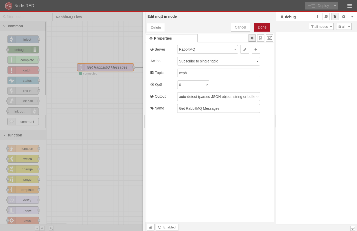 - queues: In RabbitMQ we’re taking in AMQP messages and then sending them out over MQTT, mostly because we can but also because MQTT is native in Node-RED which made things a but easier. In order to do that we need to create a queue for the messages that should go to MQTT. That is what the ceph_q queue is for. It’s specifically to have a place to push MQTT messages.